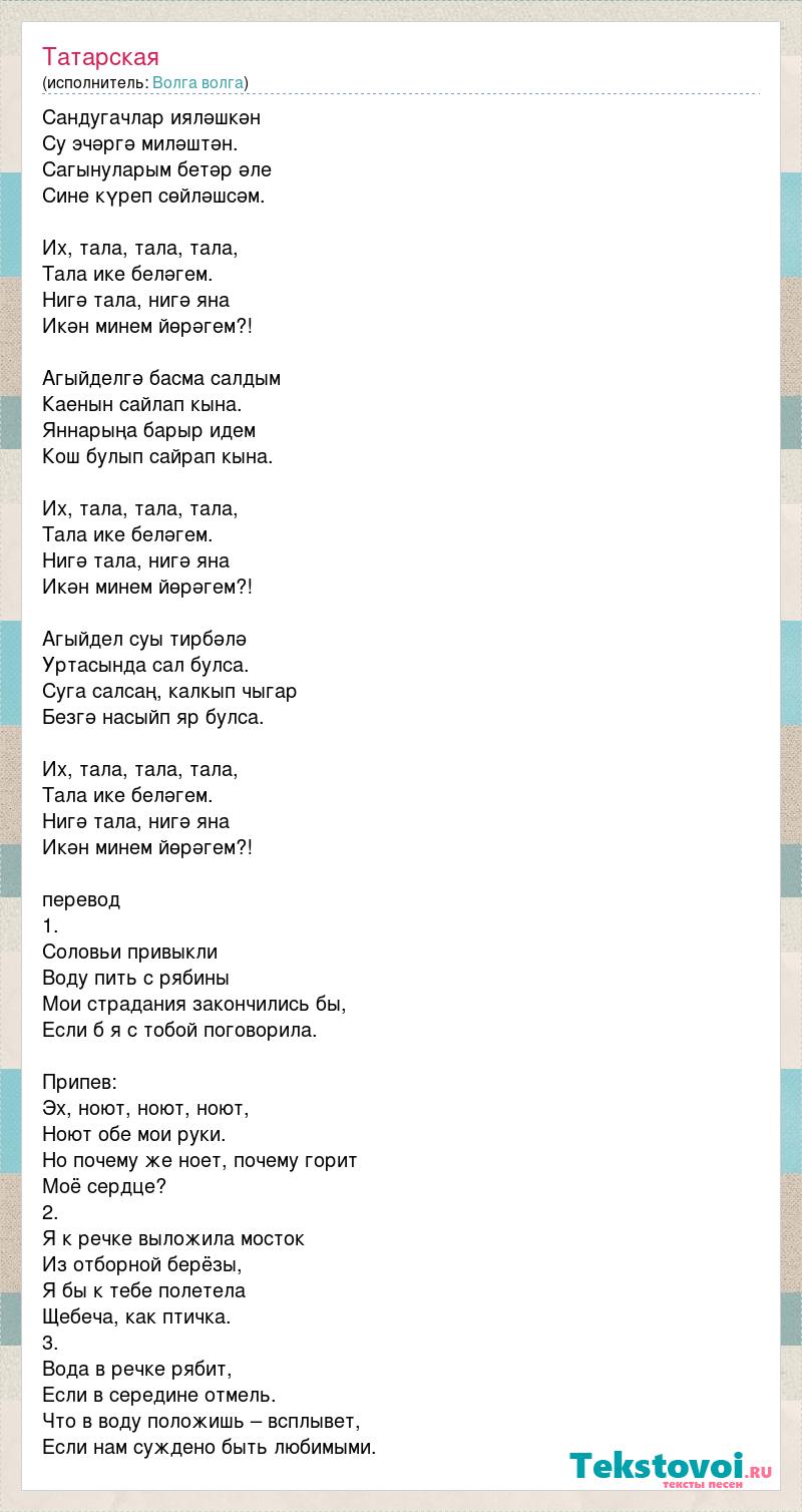 Сандугачлар ияләшкән Су эчәргә миләштән. Сагынуларым бетәр әле Сине күреп сөйләшсәм. Их, тала, тала, тала, Тала ике беләгем. Нигә тала, нигә яна Икән минем йөрәгем?! Агыйделгә басма салдым Каенын сайлап кына. Яннарыңа барыр идем Кош булып сайрап кына. Их, тала, тала, тала, Тала ике беләгем. Нигә тала, нигә яна Икән минем йөрәгем?! Агыйдел суы тирбәлә Уртасында сал булса. Суга салсаң, калкып чыгар Безгә насыйп яр булса. Их, тала, тала, тала, Тала ике беләгем. Нигә тала, нигә яна Икән минем йөрәгем?! перевод 1. Соловьи привыкли Воду пить с рябины Мои страдания закончились бы, Если б я с тобой поговорила. Припев: Эх, ноют, ноют, ноют, Ноют обе мои руки. Но почему же ноет, почему горит Моё сердце? 2. Я к речке выложила мосток Из отборной берёзы, Я бы к тебе полетела Щебеча, как птичка. 3. Вода в речке рябит, Если в середине отмель. Что в воду положишь – всплывет, Если нам суждено быть любимыми.