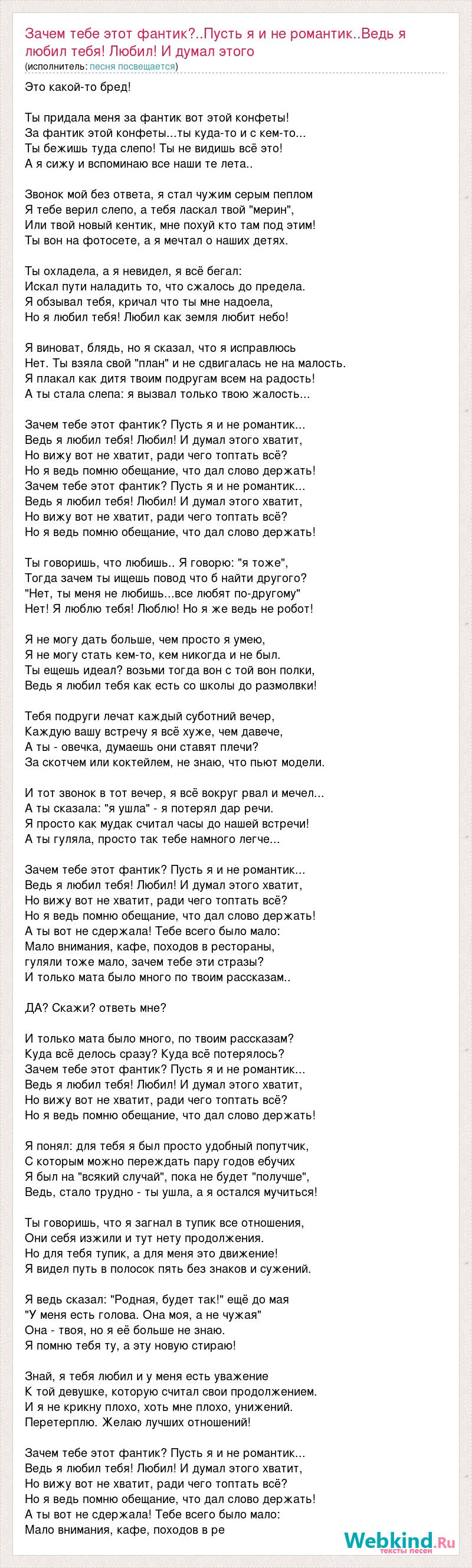 Главная→Исполнители→Песня посвещается→Зачем тебе этот фантик?..Пусть я и не романтик..Ведь я любил тебя! Любил! И дума