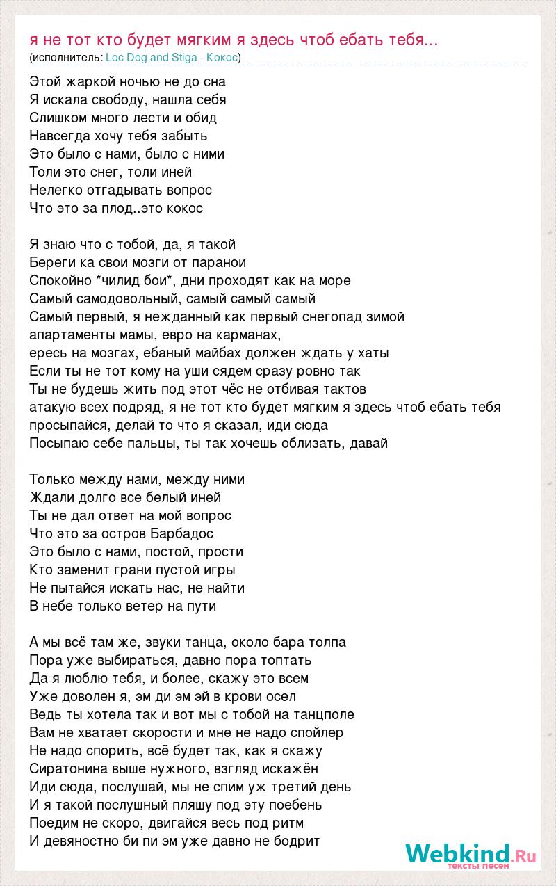 Этой жаркой ночью не до сна Я искала свободу, нашла себя Слишком много лести и обид Навсегда хочу тебя забыть Это было с нами, было с ними Толи это снег, толи иней Нелегко отгадывать вопрос Что это за плод..это кокос Я знаю что с тобой, да, я такой Береги ка свои мозги от паранои Спокойно *чилид бои*, дни проходят как на море Самый самодовольный, самый самый самый Самый первый, я нежданный как первый снегопад зимой апартаменты мамы, евро на карманах, ересь на мозгах, ебаный майбах должен ждать у хаты Если ты не тот кому на уши сядем сразу ровно так Ты не будешь жить под этот чёс не отбивая тактов атакую всех подряд, я не тот кто будет мягким я здесь чтоб ебать тебя просыпайся, делай то что я сказал, иди сюда Посыпаю себе пальцы, ты так хочешь облизать, давай Только между нами, между ними Ждали долго все белый иней Ты не дал ответ на мой вопрос Что это за остров Барбадос Это было с нами, постой, прости Кто заменит грани пустой игры Не пытайся искать нас, не найти В небе только ветер на пути А мы всё там же, звуки танца, около бара толпа Пора уже выбираться, давно пора топтать Да я люблю тебя, и более, скажу это всем Уже доволен я, эм ди эм эй в крови осел Ведь ты хотела так и вот мы с тобой на танцполе Вам не хватает скорости и мне не надо спойлер Не надо спорить, всё будет так, как я скажу Сиратонина выше нужного, взгляд искажён Иди сюда, послушай, мы не спим уж третий день И я такой послушный пляшу под эту поебень Поедим не скоро, двигайся весь под ритм И девяностно би пи эм уже давно не бодрит