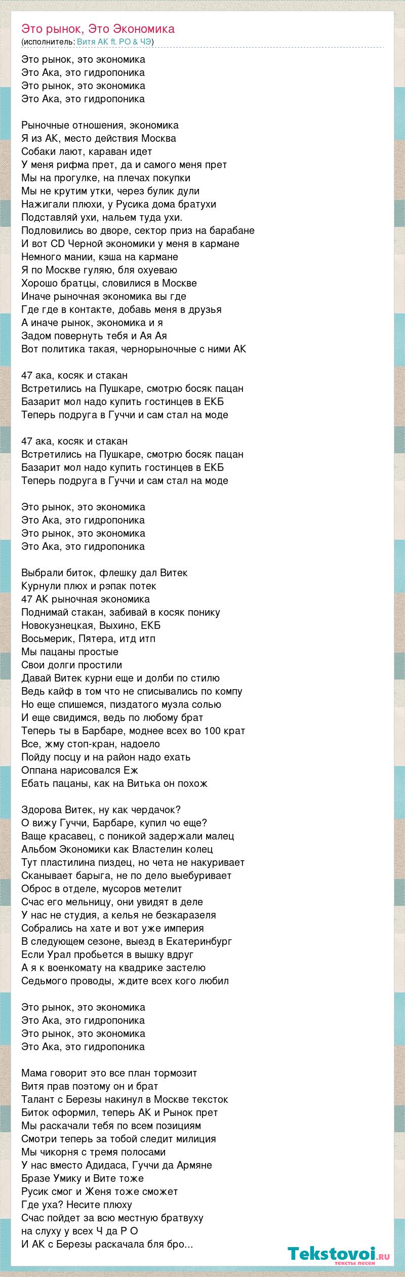 Это рынок, это экономика Это Ака, это гидропоника Это рынок, это экономика Это Ака, это гидропоника Рыночные отношения, экономика Я из АК, место действия Москва Собаки лают, караван идет У меня рифма прет, да и самого меня прет Мы на прогулке, на плечах покупки Мы не крутим утки, через булик дули Нажигали плюхи, у Русика дома братухи Подставляй ухи, нальем туда ухи. Подловились во дворе, сектор приз на барабане И вот CD Черной экономики у меня в кармане Немного мании, кэша на кармане Я по Москве гуляю, бля охуеваю Хорошо братцы, словилися в Москве Иначе рыночная экономика вы где Где где в контакте, добавь меня в друзья А иначе рынок, экономика и я Задом повернуть тебя и Ая Ая Вот политика такая, чернорыночные с ними АК 47 ака, косяк и стакан Встретились на Пушкаре, смотрю босяк пацан Базарит мол надо купить гостинцев в ЕКБ Теперь подруга в Гуччи и сам стал на моде 47 ака, косяк и стакан Встретились на Пушкаре, смотрю босяк пацан Базарит мол надо купить гостинцев в ЕКБ Теперь подруга в Гуччи и сам стал на моде Это рынок, это экономика Это Ака, это гидропоника Это рынок, это экономика Это Ака, это гидропоника Выбрали биток, флешку дал Витек Курнули плюх и рэпак потек 47 АК рыночная экономика Поднимай стакан, забивай в косяк понику Новокузнецкая, Выхино, ЕКБ Восьмерик, Пятера, итд итп Мы пацаны простые Свои долги простили Давай Витек курни еще и долби по стилю Ведь кайф в том что не списывались по компу Но еще спишемся, пиздатого музла солью И еще свидимся, ведь по любому брат Теперь ты в Барбаре, моднее всех во 100 крат Все, жму стоп-кран, надоело Пойду посцу и на район надо ехать Оппана нарисовался Еж Ебать пацаны, как на Витька он похож Здорова Витек, ну как чердачок? О вижу Гуччи, Барбаре, купил чо еще? Ваще красавец, с поникой задержали малец Альбом Экономики как Властелин колец Тут пластилина пиздец, но чета не накуривает Сканывает барыга, не по дело выебуривает Оброс в отделе, мусоров метелит Счас его мельницу, они увидят в деле У нас не студия, а келья не безкаразеля Собрались на хате и вот уже империя В следующем сезоне, выезд в Екатеринбург Если Урал пробьется в вышку вдруг А я к военкомату на квадрике застелю Седьмого проводы, ждите всех кого любил Это рынок, это экономика Это Ака, это гидропоника Это рынок, это экономика Это Ака, это гидропоника Мама говорит это все план тормозит Витя прав поэтому он и брат Талант с Березы накинул в Москве тексток Биток оформил, теперь АК и Рынок прет Мы раскачали тебя по всем позициям Смотри теперь за тобой следит милиция Мы чикорня с тремя полосами У нас вместо Адидаса, Гуччи да Армяне Бразе Умику и Вите тоже Русик смог и Женя тоже сможет Где уха? Несите плюху Счас пойдет за всю местную братвуху на слуху у всех Ч да Р О И АК с Березы раскачала бля бро...