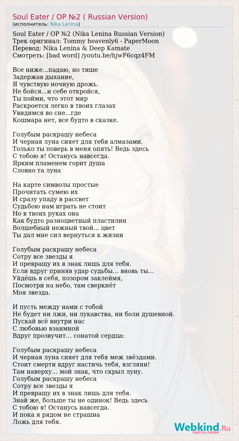 Soul Eater / OP №2 (Nika Lenina Russian Version) Трек оригинал: Tommy heavenly6 - PaperMoon Перевод: Nika Lenina & Deep Kamate Смотреть: [bad word] /youtu.be/hjwF6cqz4FM Все ниже...падаю, но тише Задержав дыхание, Я чувствую ночную дрожь. Не бойся...и себе откройся, Ты пойми, что этот мир Раскроется легко в твоих глазах Увидимся во сне...где Кошмара нет, все будто в сказке. Голубым раскрашу небеса И черная луна сияет для тебя алмазами. Только ты поверь в меня опять! Ведь здесь С тобою я! Останусь навсегда. Ярким пламенем горит душа Словно та луна На карте символы простые Прочитать сумею их И сразу упаду в рассвет Судьбою нам играть не стоит Но в твоих руках она Как будто разноцветный пластилин Волшебный нежный твой... цвет Ты дал мне сил вернуться к жизни Голубым раскрашу небеса Сотру все звезды я И превращу их в знак лишь для тебя. Если вдруг приняв удар судьбы… вновь ты… Уйдёшь в себя, позором заклеймя, Посмотри на небо, там сверкнёт Моя звезда. И пусть между нами с тобой Не будет ни лжи, ни лукавства, ни боли душевной. Пускай всё внутри нас С любовью взаимной Вдруг прозвучит… сонатой сердца: Голубым раскрашу небеса И черная луна сияет для тебя меж звёздами. Стоит смерти вдруг настичь тебя, взгляни! Там наверху… мой знак, что скрыл луну. Голубым раскрашу небеса Сотру все звезды я И превращу их в знак лишь для тебя. Знай же, больше ты не одинок! Ведь здесь С тобою я! Останусь навсегда. И пока я рядом не страшна Ложь для тебя.