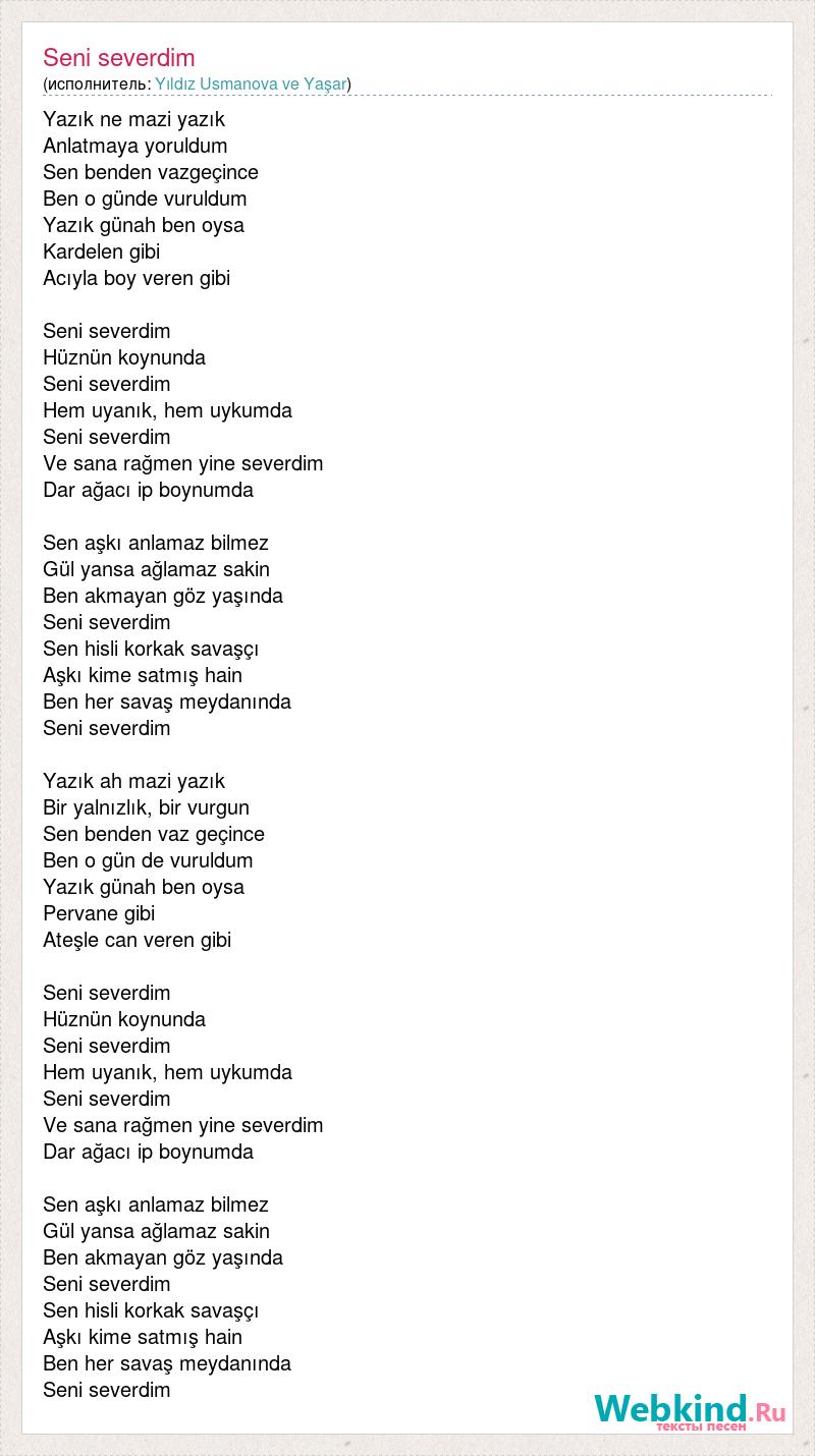 Yazık ne mazi yazık Anlatmaya yoruldum Sen benden vazgeçince Ben o günde vuruldum Yazık günah ben oysa Kardelen gibi Acıyla boy veren gibi Seni severdim Hüznün koynunda Seni severdim Hem uyanık, hem uykumda Seni severdim Ve sana rağmen yine severdim Dar ağacı ip boynumda Sen aşkı anlamaz bilmez Gül yansa ağlamaz sakin Ben akmayan göz yaşında Seni severdim Sen hisli korkak savaşçı Aşkı kime satmış hain Ben her savaş meydanında Seni severdim Yazık ah mazi yazık Bir yalnızlık, bir vurgun Sen benden vaz geçince Ben o gün de vuruldum Yazık günah ben oysa Pervane gibi Ateşle can veren gibi Seni severdim Hüznün koynunda Seni severdim Hem uyanık, hem uykumda Seni severdim Ve sana rağmen yine severdim Dar ağacı ip boynumda Sen aşkı anlamaz bilmez Gül yansa ağlamaz sakin Ben akmayan göz yaşında Seni severdim Sen hisli korkak savaşçı Aşkı kime satmış hain Ben her savaş meydanında Seni severdim