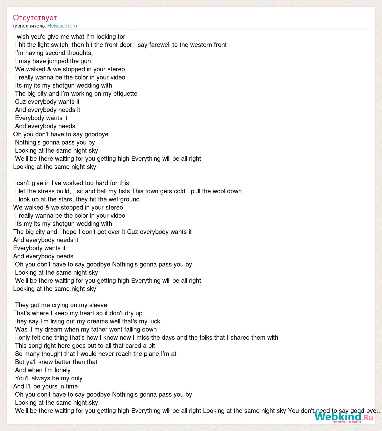 I wish you'd give me what I'm looking for I hit the light switch, then hit the front door I say farewell to the western front I’m having second thoughts, I may have jumped the gun We walked & we stopped in your stereo I really wanna be the color in your video Its my its my shotgun wedding with The big city and I’m working on my etiquette Cuz everybody wants it And everybody needs it Everybody wants it And everybody needs Oh you don't have to say goodbye Nothing’s gonna pass you by Looking at the same night sky We’ll be there waiting for you getting high Everything will be all right Looking at the same night sky I can’t give in I’ve worked too hard for this I let the stress build, I sit and ball my fists This town gets cold I pull the wool down I look up at the stars, they hit the wet ground We walked & we stopped in your stereo I really wanna be the color in your video Its my its my shotgun wedding with The big city and I hope I don’t get over it Cuz everybody wants it And everybody needs it Everybody wants it And everybody needs Oh you don't have to say goodbye Nothing’s gonna pass you by Looking at the same night sky We’ll be there waiting for you getting high Everything will be all right Looking at the same night sky They got me crying on my sleeve That's where I keep my heart so it don't dry up They say I’m living out my dreams well that's my luck Was it my dream when my father went falling down I only felt one thing that's how I know now I miss the days and the folks that I shared them with This song right here goes out to all that cared a bit So many thought that I would never reach the plane I’m at But ya'll knew better then that And when I’m lonely You'll always be my only And I’ll be yours in time Oh you don't have to say goodbye Nothing’s gonna pass you by Looking at the same night sky We’ll be there waiting for you getting high Everything will be all right Looking at the same night sky You don't need to say good-bye...