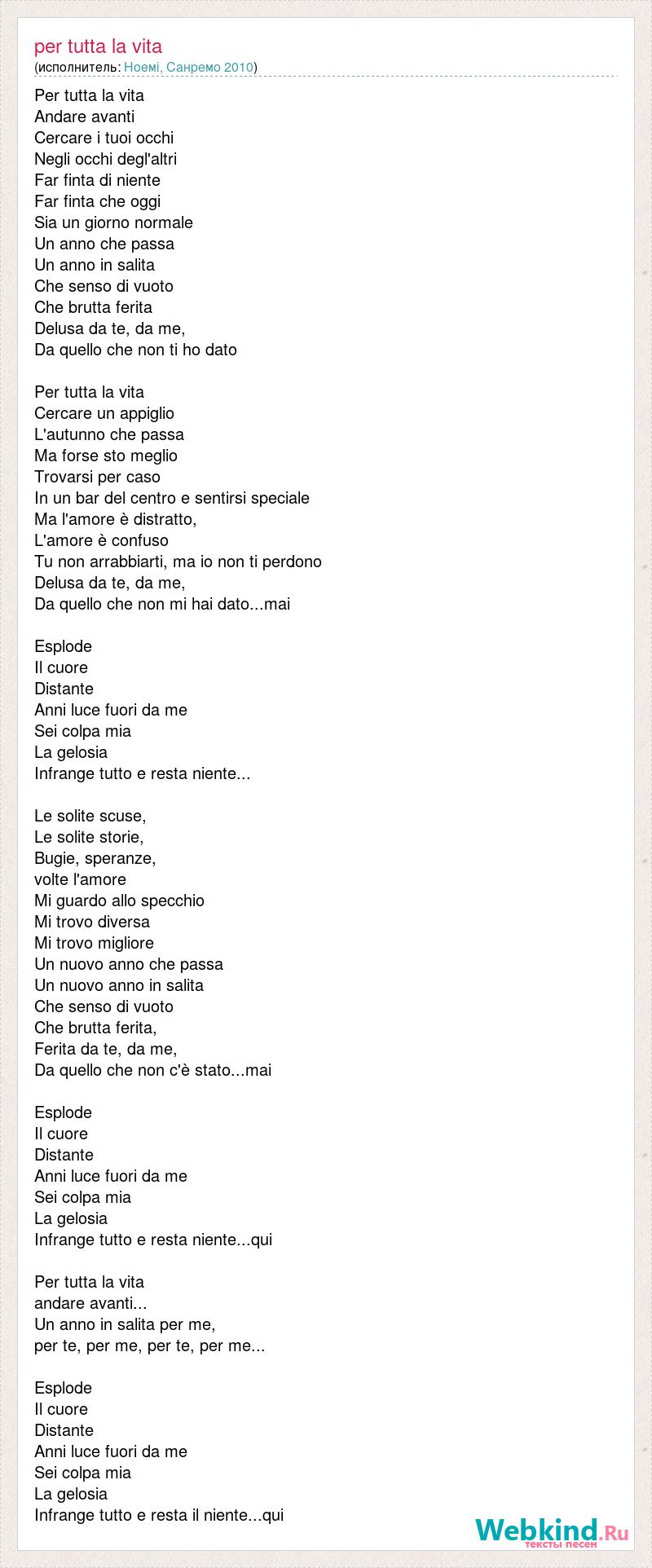 Per tutta la vita Andare avanti Cercare i tuoi occhi Negli occhi degl'altri Far finta di niente Far finta che oggi Sia un giorno normale Un anno che passa Un anno in salita Che senso di vuoto Che brutta ferita Delusa da te, da me, Da quello che non ti ho dato Per tutta la vita Cercare un appiglio L'autunno che passa Ma forse sto meglio Trovarsi per caso In un bar del centro e sentirsi speciale Ma l'amore è distratto, L'amore è confuso Tu non arrabbiarti, ma io non ti perdono Delusa da te, da me, Da quello che non mi hai dato...mai Esplode Il cuore Distante Anni luce fuori da me Sei colpa mia La gelosia Infrange tutto e resta niente... Le solite scuse, Le solite storie, Bugie, speranze, volte l'amore Mi guardo allo specchio Mi trovo diversa Mi trovo migliore Un nuovo anno che passa Un nuovo anno in salita Che senso di vuoto Che brutta ferita, Ferita da te, da me, Da quello che non c'è stato...mai Esplode Il cuore Distante Anni luce fuori da me Sei colpa mia La gelosia Infrange tutto e resta niente...qui Per tutta la vita andare avanti... Un anno in salita per me, per te, per me, per te, per me... Esplode Il cuore Distante Anni luce fuori da me Sei colpa mia La gelosia Infrange tutto e resta il niente...qui