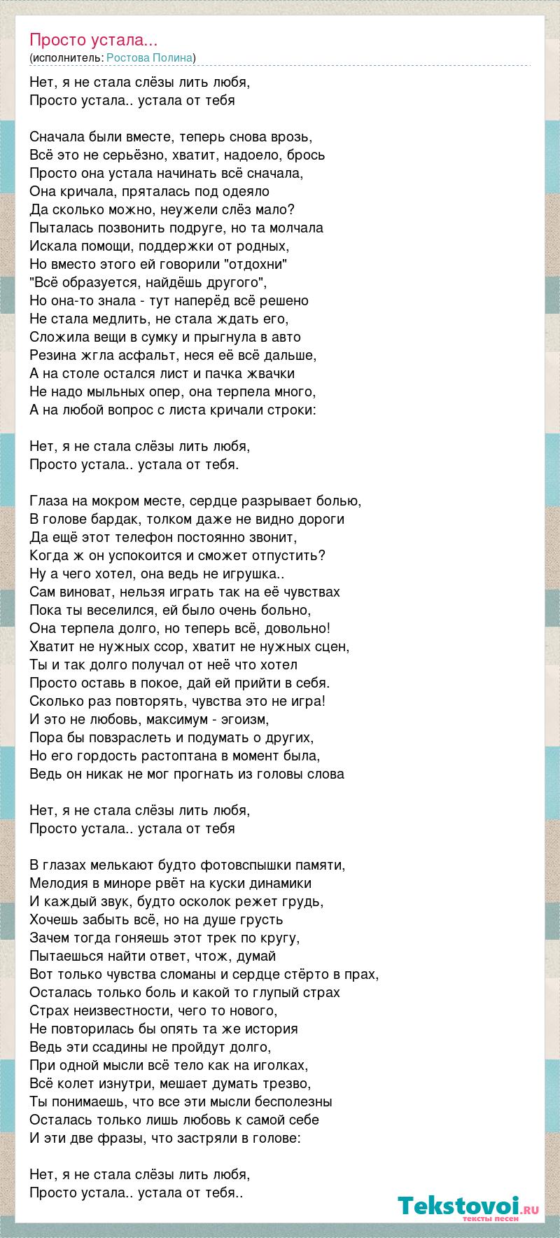 Нет, я не стала слёзы лить любя, Просто устала.. устала от тебя Сначала были вместе, теперь снова врозь, Всё это не серьёзно, хватит, надоело, брось Просто она устала начинать всё сначала, Она кричала, пряталась под одеяло Да сколько можно, неужели слёз мало? Пыталась позвонить подруге, но та молчала Искала помощи, поддержки от родных, Но вместо этого ей говорили "отдохни" "Всё образуется, найдёшь другого", Но она-то знала - тут наперёд всё решено Не стала медлить, не стала ждать его, Сложила вещи в сумку и прыгнула в авто Резина жгла асфальт, неся её всё дальше, А на столе остался лист и пачка жвачки Не надо мыльных опер, она терпела много, А на любой вопрос с листа кричали строки: Нет, я не стала слёзы лить любя, Просто устала.. устала от тебя. Глаза на мокром месте, сердце разрывает болью, В голове бардак, толком даже не видно дороги Да ещё этот телефон постоянно звонит, Когда ж он успокоится и сможет отпустить? Ну а чего хотел, она ведь не игрушка.. Сам виноват, нельзя играть так на её чувствах Пока ты веселился, ей было очень больно, Она терпела долго, но теперь всё, довольно! Хватит не нужных ссор, хватит не нужных сцен, Ты и так долго получал от неё что хотел Просто оставь в покое, дай ей прийти в себя. Сколько раз повторять, чувства это не игра! И это не любовь, максимум - эгоизм, Пора бы повзраслеть и подумать о других, Но его гордость растоптана в момент была, Ведь он никак не мог прогнать из головы слова Нет, я не стала слёзы лить любя, Просто устала.. устала от тебя В глазах мелькают будто фотовспышки памяти, Мелодия в миноре рвёт на куски динамики И каждый звук, будто осколок режет грудь, Хочешь забыть всё, но на душе грусть Зачем тогда гоняешь этот трек по кругу, Пытаешься найти ответ, чтож, думай Вот только чувства сломаны и сердце стёрто в прах, Осталась только боль и какой то глупый страх Страх неизвестности, чего то нового, Не повторилась бы опять та же история Ведь эти ссадины не пройдут долго, При одной мысли всё тело как на иголках, Всё колет изнутри, мешает думать трезво, Ты понимаешь, что все эти мысли бесполезны Осталась только лишь любовь к самой себе И эти две фразы, что застряли в голове: Нет, я не стала слёзы лить любя, Просто устала.. устала от тебя..