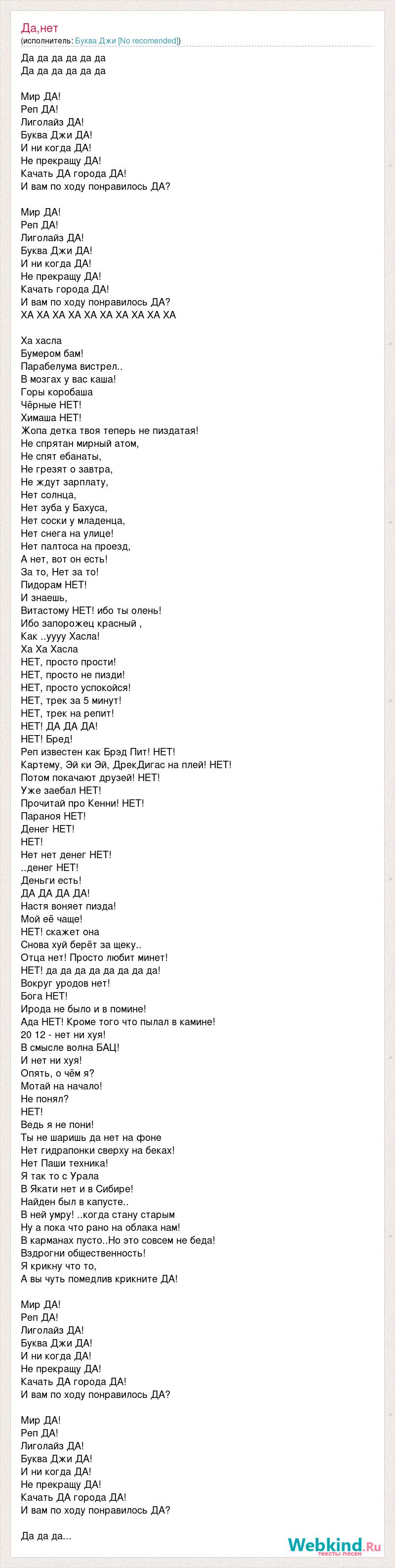 Да да да да да да Да да да да да да Мир ДА! Реп ДА! Лиголайз ДА! Буква Джи ДА! И ни когда ДА! Не прекращу ДА! Качать ДА города ДА! И вам по ходу понравилось ДА? Мир ДА! Реп ДА! Лиголайз ДА! Буква Джи ДА! И ни когда ДА! Не прекращу ДА! Качать города ДА! И вам по ходу понравилось ДА? ХА ХА ХА ХА ХА ХА ХА ХА ХА ХА Ха хасла Бумером бам! Парабелума вистрел.. В мозгах у вас каша! Горы коробаша Чёрные НЕТ! Химаша НЕТ! Жопа детка твоя теперь не пиздатая! Не спрятан мирный атом, Не спят ебанаты, Не грезят о завтра, Не ждут зарплату, Нет солнца, Нет зуба у Бахуса, Нет соски у младенца, Нет снега на улице! Нет палтоса на проезд, А нет, вот он есть! За то, Нет за то! Пидорам НЕТ! И знаешь, Витастому НЕТ! ибо ты олень! Ибо запорожец красный , Как ..уууу Хасла! Ха Ха Хасла НЕТ, просто прости! НЕТ, просто не пизди! НЕТ, просто успокойся! НЕТ, трек за 5 минут! НЕТ, трек на репит! НЕТ! ДА ДА ДА! НЕТ! Бред! Реп известен как Брэд Пит! НЕТ! Картему, Эй ки Эй, ДрекДигас на плей! НЕТ! Потом покачают друзей! НЕТ! Уже заебал НЕТ! Прочитай про Кенни! НЕТ! Параноя НЕТ! Денег НЕТ! НЕТ! Нет нет денег НЕТ! ..денег НЕТ! Деньги есть! ДА ДА ДА ДА! Настя воняет пизда! Мой её чаще! НЕТ! скажет она Снова хуй берёт за щеку.. Отца нет! Просто любит минет! НЕТ! да да да да да да да да! Вокруг уродов нет! Бога НЕТ! Ирода не было и в помине! Ада НЕТ! Кроме того что пылал в камине! 20 12 - нет ни хуя! В смысле волна БАЦ! И нет ни хуя! Опять, о чём я? Мотай на начало! Не понял? НЕТ! Ведь я не пони! Ты не шаришь да нет на фоне Нет гидрапонки сверху на беках! Нет Паши техника! Я так то с Урала В Якати нет и в Сибире! Найден был в капусте.. В ней умру! ..когда стану старым Ну а пока что рано на облака нам! В карманах пусто..Но это совсем не беда! Вздрогни общественность! Я крикну что то, А вы чуть помедлив крикните ДА! Мир ДА! Реп ДА! Лиголайз ДА! Буква Джи ДА! И ни когда ДА! Не прекращу ДА! Качать ДА города ДА! И вам по ходу понравилось ДА? Мир ДА! Реп ДА! Лиголайз ДА! Буква Джи ДА! И ни когда ДА! Не прекращу ДА! Качать ДА города ДА! И вам по ходу понравилось ДА? Да да да...