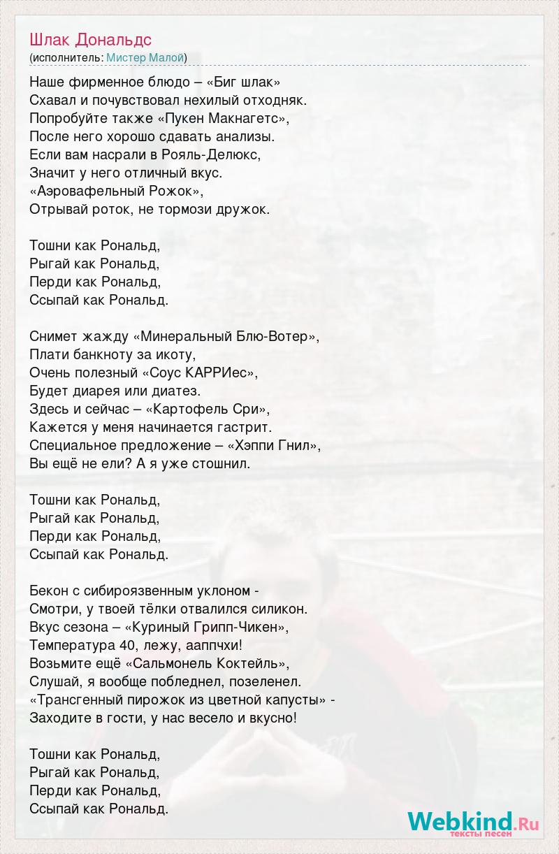 Наше фирменное блюдо – «Биг шлак» Схавал и почувствовал нехилый отходняк. Попробуйте также «Пукен Макнагетс», После него хорошо сдавать анализы. Если вам насрали в Рояль-Делюкс, Значит у него отличный вкус. «Аэровафельный Рожок», Отрывай роток, не тормози дружок. Тошни как Рональд, Рыгай как Рональд, Перди как Рональд, Ссыпай как Рональд. Снимет жажду «Минеральный Блю-Вотер», Плати банкноту за икоту, Очень полезный «Соус КАРРИес», Будет диарея или диатез. Здесь и сейчас – «Картофель Сри», Кажется у меня начинается гастрит. Специальное предложение – «Хэппи Гнил», Вы ещё не ели? А я уже стошнил. Тошни как Рональд, Рыгай как Рональд, Перди как Рональд, Ссыпай как Рональд. Бекон с сибироязвенным уклоном - Смотри, у твоей тёлки отвалился силикон. Вкус сезона – «Куриный Грипп-Чикен», Температура 40, лежу, ааппчхи! Возьмите ещё «Сальмонель Коктейль», Слушай, я вообще побледнел, позеленел. «Трансгенный пирожок из цветной капусты» - Заходите в гости, у нас весело и вкусно! Тошни как Рональд, Рыгай как Рональд, Перди как Рональд, Ссыпай как Рональд.