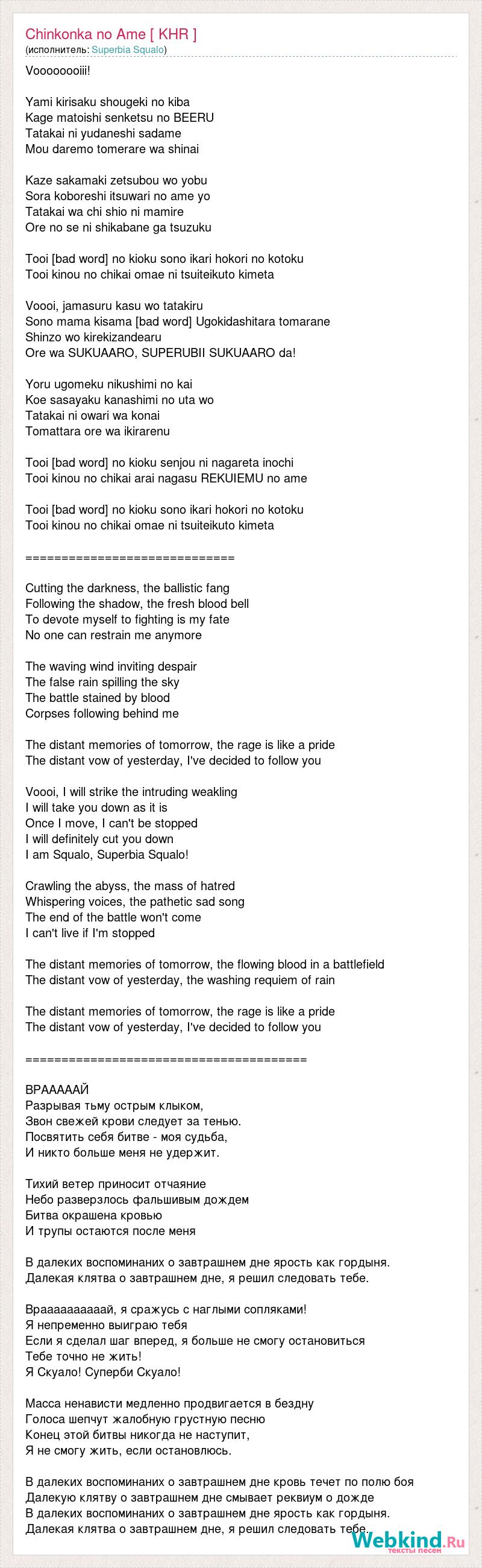 Voooooooiii! Yami kirisaku shougeki no kiba Kage matoishi senketsu no BEERU Tatakai ni yudaneshi sadame Mou daremo tomerare wa shinai Kaze sakamaki zetsubou wo yobu Sora koboreshi itsuwari no ame yo Tatakai wa chi shio ni mamire Ore no se ni shikabane ga tsuzuku Tooi [bad word] no kioku sono ikari hokori no kotoku Tooi kinou no chikai omae ni tsuiteikuto kimeta Voooi, jamasuru kasu wo tatakiru Sono mama kisama [bad word] Ugokidashitara tomarane Shinzo wo kirekizandearu Ore wa SUKUAARO, SUPERUBII SUKUAARO da! Yoru ugomeku nikushimi no kai Koe sasayaku kanashimi no uta wo Tatakai ni owari wa konai Tomattara ore wa ikirarenu Tooi [bad word] no kioku senjou ni nagareta inochi Tooi kinou no chikai arai nagasu REKUIEMU no ame Tooi [bad word] no kioku sono ikari hokori no kotoku Tooi kinou no chikai omae ni tsuiteikuto kimeta ============================= Cutting the darkness, the ballistic fang Following the shadow, the fresh blood bell To devote myself to fighting is my fate No one can restrain me anymore The waving wind inviting despair The false rain spilling the sky The battle stained by blood Corpses following behind me The distant memories of tomorrow, the rage is like a pride The distant vow of yesterday, I've decided to follow you Voooi, I will strike the intruding weakling I will take you down as it is Once I move, I can't be stopped I will definitely cut you down I am Squalo, Superbia Squalo! Crawling the abyss, the mass of hatred Whispering voices, the pathetic sad song The end of the battle won't come I can't live if I'm stopped The distant memories of tomorrow, the flowing blood in a battlefield The distant vow of yesterday, the washing requiem of rain The distant memories of tomorrow, the rage is like a pride The distant vow of yesterday, I've decided to follow you ======================================= ВРАААААЙ Разрывая тьму острым клыком, Звон свежей крови следует за тенью. Посвятить себя битве - моя судьба, И никто больше меня не удержит. Тихий ветер приносит отчаяние Небо разверзлось фальшивым дождем Битва окрашена кровью И трупы остаются после меня В далеких воспоминаних о завтрашнем дне ярость как гордыня. Далекая клятва о завтрашнем дне, я решил следовать тебе. Враааааааааай, я сражусь с наглыми сопляками! Я непременно выиграю тебя Если я сделал шаг вперед, я больше не смогу остановиться Тебе точно не жить! Я Скуало! Суперби Скуало! Масса ненависти медленно продвигается в бездну Голоса шепчут жалобную грустную песню Конец этой битвы никогда не наступит, Я не смогу жить, если остановлюсь. В далеких воспоминаних о завтрашнем дне кровь течет по полю боя Далекую клятву о завтрашнем дне смывает реквиум о дожде В далеких воспоминаних о завтрашнем дне ярость как гордыня. Далекая клятва о завтрашнем дне, я решил следовать тебе.
