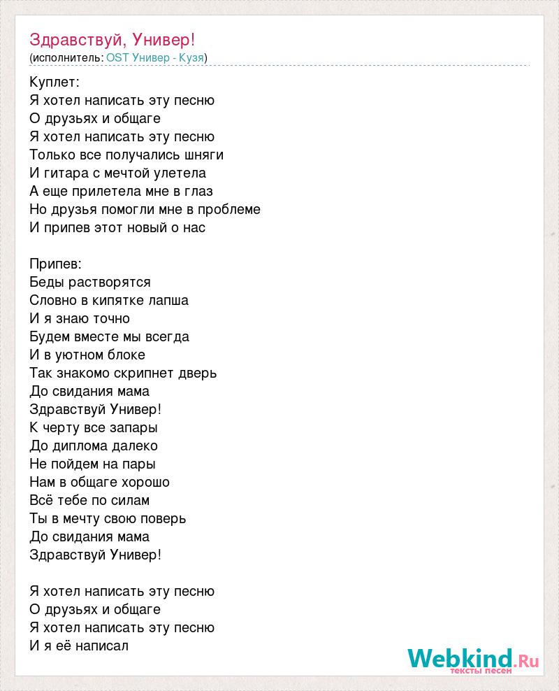 Куплет: Я хотел написать эту песню О друзьях и общаге Я хотел написать эту песню Только все получались шняги И гитара с мечтой улетела А еще прилетела мне в глаз Но друзья помогли мне в проблеме И припев этот новый о нас Припев: Беды растворятся Словно в кипятке лапша И я знаю точно Будем вместе мы всегда И в уютном блоке Так знакомо скрипнет дверь До свидания мама Здравствуй Универ! К черту все запары До диплома далеко Не пойдем на пары Нам в общаге хорошо Всё тебе по силам Ты в мечту свою поверь До свидания мама Здравствуй Универ! Я хотел написать эту песню О друзьях и общаге Я хотел написать эту песню И я её написал