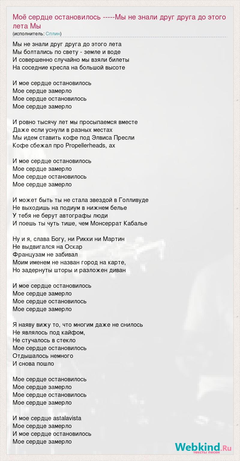 Мы не знали друг друга до этого лета Мы болтались по свету - земле и воде И совершенно случайно мы взяли билеты На соседние кресла на большой высоте И мое сердце остановилось Мое сердце замерло Мое сердце остановилось Мое сердце замерло И ровно тысячу лет мы просыпаемся вместе Даже если уснули в разных местах Мы идем ставить кофе под Элвиса Пресли Кофе сбежал про Propellerheads, ах И мое сердце остановилось Мое сердце замерло Мое сердце остановилось Мое сердце замерло И может быть ты не стала звездой в Голливуде Не выходишь на подиум в нижнем белье У тебя не берут автографы люди И поешь ты чуть тише, чем Монсеррат Кабалье Ну и я, слава Богу, ни Рикки ни Мартин Не выдвигался на Оскар Французам не забивал Моим именем не назван город на карте, Но задернуты шторы и разложен диван И мое сердце остановилось Мое сердце замерло Мое сердце остановилось Мое сердце замерло Я наяву вижу то, что многим даже не снилось Не являлось под кайфом, Не стучалось в стекло Мое сердце остановилось Отдышалось немного И снова пошло Мое сердце остановилось Мое сердце замерло Мое сердце остановилось Мое сердце замерло И мое сердце astalavista Мое сердце замерло И мое сердце остановилось Мое сердце замерло