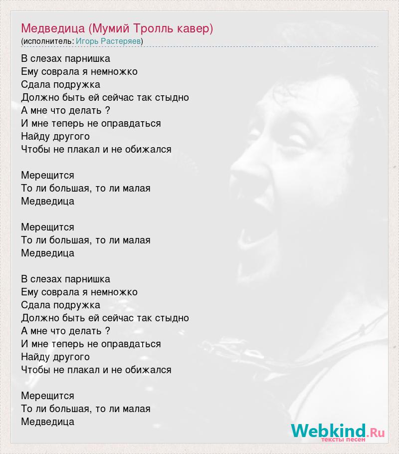 В слезах парнишка Ему соврала я немножко Сдала подружка Должно быть ей сейчас так стыдно А мне что делать ? И мне теперь не оправдаться Найду другого Чтобы не плакал и не обижался Мерещится То ли большая, то ли малая Медведица Мерещится То ли большая, то ли малая Медведица В слезах парнишка Ему соврала я немножко Сдала подружка Должно быть ей сейчас так стыдно А мне что делать ? И мне теперь не оправдаться Найду другого Чтобы не плакал и не обижался Мерещится То ли большая, то ли малая Медведица
