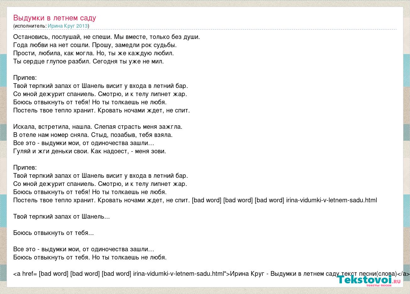 Остановись, послушай, не спеши. Мы вместе, только без души. Года любви на нет сошли. Прошу, замедли рок судьбы. Прости, любила, как могла. Но, ты же каждую любил. Ты сердце глупое разбил. Сегодня ты уже не мил. Припев: Твой терпкий запах от Шанель висит у входа в летний бар. Со мной дежурит спаниель. Смотрю, и к телу липнет жар. Боюсь отвыкнуть от тебя! Но ты толкаешь не любя. Постель твое тепло хранит. Кровать ночами ждет, не спит. Искала, встретила, нашла. Слепая страсть меня зажгла. В отеле нам номер сняла. Стыд, позабыв, тебя взяла. Все это - выдумки мои, от одиночества зашли… Гуляй и жги деньки свои. Как надоест, - меня зови. Припев: Твой терпкий запах от Шанель висит у входа в летний бар. Со мной дежурит спаниель. Смотрю, и к телу липнет жар. Боюсь отвыкнуть от тебя! Но ты толкаешь не любя. Постель твое тепло хранит. Кровать ночами ждет, не спит. [bad word] [bad word] krug-irina-vidumki-v-letnem-sadu.html Твой терпкий запах от Шанель... Боюсь отвыкнуть от тебя... Все это - выдумки мои, от одиночества зашли… Боюсь отвыкнуть от тебя. Но ты толкаешь не любя. <a href= [bad word] [bad word] krug-irina-vidumki-v-letnem-sadu.html">Ирина Круг - Выдумки в летнем саду текст песни(слова)</a>