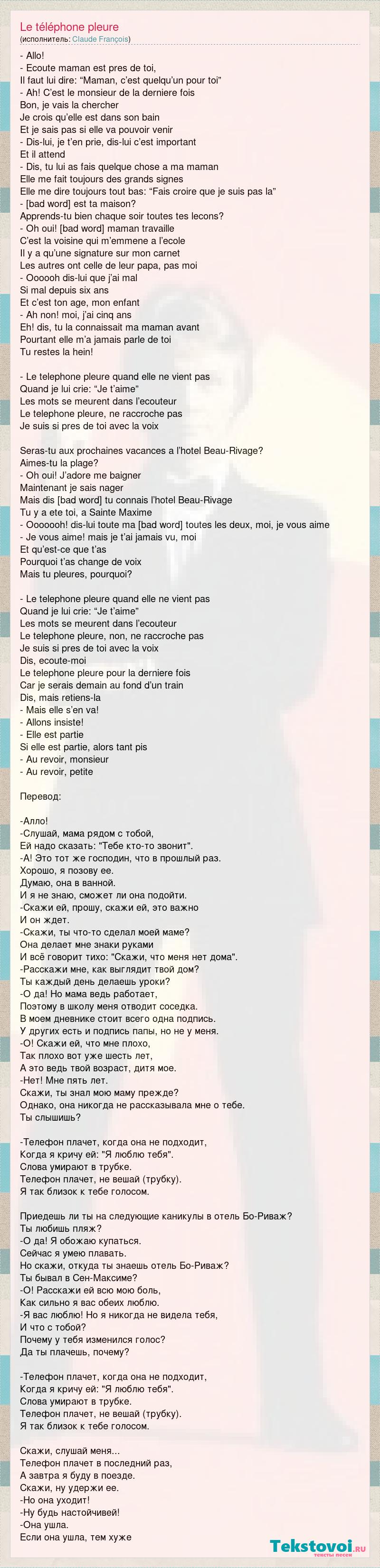 - Allo! - Ecoute maman est pres de toi, Il faut lui dire: “Maman, c’est quelqu’un pour toi” - Ah! C’est le monsieur de la derniere fois Bon, je vais la chercher Je crois qu’elle est dans son bain Et je sais pas si elle va pouvoir venir - Dis-lui, je t’en prie, dis-lui c’est important Et il attend - Dis, tu lui as fais quelque chose a ma maman Elle me fait toujours des grands signes Elle me dire toujours tout bas: “Fais croire que je suis pas la” - Raconte-moi comment est ta maison? Apprends-tu bien chaque soir toutes tes lecons? - Oh oui! mais comme maman travaille C’est la voisine qui m’emmene a l’ecole Il y a qu’une signature sur mon carnet Les autres ont celle de leur papa, pas moi - Oooooh dis-lui que j’ai mal Si mal depuis six ans Et c’est ton age, mon enfant - Ah non! moi, j’ai cinq ans Eh! dis, tu la connaissait ma maman avant Pourtant elle m’a jamais parle de toi Tu restes la hein! - Le telephone pleure quand elle ne vient pas Quand je lui crie: “Je t’aime” Les mots se meurent dans l’ecouteur Le telephone pleure, ne raccroche pas Je suis si pres de toi avec la voix Seras-tu aux prochaines vacances a l’hotel Beau-Rivage? Aimes-tu la plage? - Oh oui! J’adore me baigner Maintenant je sais nager Mais dis donc, comment tu connais l’hotel Beau-Rivage Tu y a ete toi, a Sainte Maxime - Ooooooh! dis-lui toute ma peine, Combien toutes les deux, moi, je vous aime - Je vous aime! mais je t’ai jamais vu, moi Et qu’est-ce que t’as Pourquoi t’as change de voix Mais tu pleures, pourquoi? - Le telephone pleure quand elle ne vient pas Quand je lui crie: “Je t’aime” Les mots se meurent dans l’ecouteur Le telephone pleure, non, ne raccroche pas Je suis si pres de toi avec la voix Dis, ecoute-moi Le telephone pleure pour la derniere fois Car je serais demain au fond d’un train Dis, mais retiens-la - Mais elle s’en va! - Allons insiste! - Elle est partie Si elle est partie, alors tant pis - Au revoir, monsieur - Au revoir, petite Перевод: -Алло! -Слушай, мама рядом с тобой, Ей надо сказать: "Тебе кто-то звонит". -А! Это тот же господин, что в прошлый раз. Хорошо, я позову ее. Думаю, она в ванной. И я не знаю, сможет ли она подойти. -Скажи ей, прошу, скажи ей, это важно И он ждет. -Скажи, ты что-то сделал моей маме? Она делает мне знаки руками И всё говорит тихо: "Скажи, что меня нет дома". -Расскажи мне, как выглядит твой дом? Ты каждый день делаешь уроки? -О да! Но мама ведь работает, Поэтому в школу меня отводит соседка. В моем дневнике стоит всего одна подпись. У других есть и подпись папы, но не у меня. -О! Скажи ей, что мне плохо, Так плохо вот уже шесть лет, А это ведь твой возраст, дитя мое. -Нет! Мне пять лет. Скажи, ты знал мою маму прежде? Однако, она никогда не рассказывала мне о тебе. Ты слышишь? -Телефон плачет, когда она не подходит, Когда я кричу ей: "Я люблю тебя". Слова умирают в трубке. Телефон плачет, не вешай (трубку). Я так близок к тебе голосом. Приедешь ли ты на следующие каникулы в отель Бо-Риваж? Ты любишь пляж? -О да! Я обожаю купаться. Сейчас я умею плавать. Но скажи, откуда ты знаешь отель Бо-Риваж? Ты бывал в Сен-Максиме? -О! Расскажи ей всю мою боль, Как сильно я вас обеих люблю. -Я вас люблю! Но я никогда не видела тебя, И что с тобой? Почему у тебя изменился голос? Да ты плачешь, почему? -Телефон плачет, когда она не подходит, Когда я кричу ей: "Я люблю тебя". Слова умирают в трубке. Телефон плачет, не вешай (трубку). Я так близок к тебе голосом. Скажи, слушай меня... Телефон плачет в последний раз, А завтра я буду в поезде. Скажи, ну удержи ее. -Но она уходит! -Ну будь настойчивей! -Она ушла. Если она ушла, тем хуже