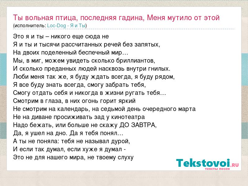 Главная→Исполнители→Loc-Dog - Я и Ты→Ты вольная птица, последняя гадина, Меня мутило от этой тупой прохлады, н