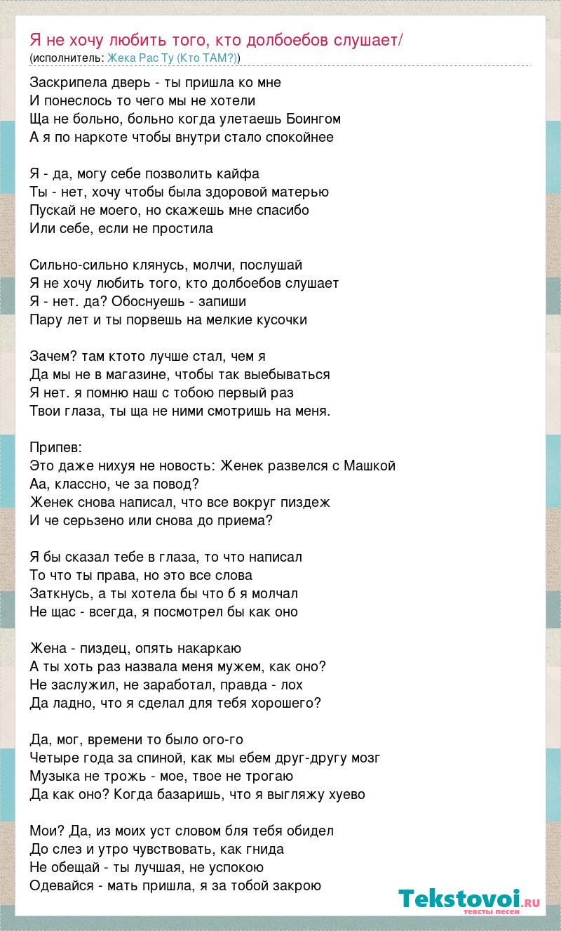 Заскрипела дверь - ты пришла ко мне И понеслось то чего мы не хотели Ща не больно, больно когда улетаешь Боингом А я по наркоте чтобы внутри стало спокойнее Я - да, могу себе позволить кайфа Ты - нет, хочу чтобы была здоровой матерью Пускай не моего, но скажешь мне спасибо Или себе, если не простила Сильно-сильно клянусь, молчи, послушай Я не хочу любить того, кто долбоебов слушает Я - нет. да? Обоснуешь - запиши Пару лет и ты порвешь на мелкие кусочки Зачем? там ктото лучше стал, чем я Да мы не в магазине, чтобы так выебываться Я нет. я помню наш с тобою первый раз Твои глаза, ты ща не ними смотришь на меня. Припев: Это даже нихуя не новость: Женек развелся с Машкой Аа, классно, че за повод? Женек снова написал, что все вокруг пиздеж И че серьзено или снова до приема? Я бы сказал тебе в глаза, то что написал То что ты права, но это все слова Заткнусь, а ты хотела бы что б я молчал Не щас - всегда, я посмотрел бы как оно Жена - пиздец, опять накаркаю А ты хоть раз назвала меня мужем, как оно? Не заслужил, не заработал, правда - лох Да ладно, что я сделал для тебя хорошего? Да, мог, времени то было ого-го Четыре года за спиной, как мы ебем друг-другу мозг Музыка не трожь - мое, твое не трогаю Да как оно? Когда базаришь, что я выгляжу хуево Мои? Да, из моих уст словом бля тебя обидел До слез и утро чувствовать, как гнида Не обещай - ты лучшая, не успокою Одевайся - мать пришла, я за тобой закрою
