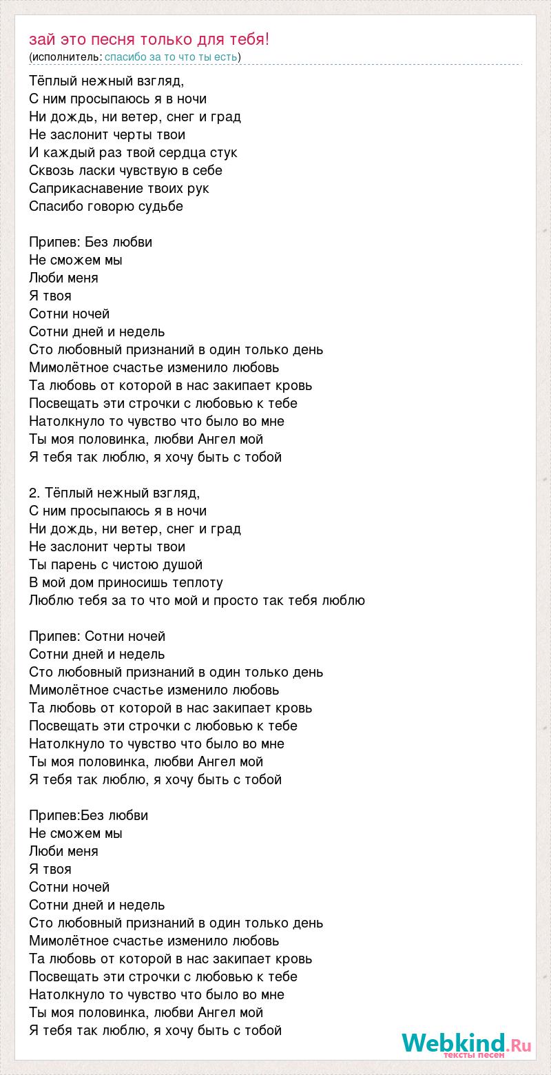 Тёплый нежный взгляд, С ним просыпаюсь я в ночи Ни дождь, ни ветер, снег и град Не заслонит черты твои И каждый раз твой сердца стук Сквозь ласки чувствую в себе Саприкаснавение твоих рук Спасибо говорю судьбе Припев: Без любви Не сможем мы Люби меня Я твоя Сотни ночей Сотни дней и недель Сто любовный признаний в один только день Мимолётное счастье изменило любовь Та любовь от которой в нас закипает кровь Посвещать эти строчки с любовью к тебе Натолкнуло то чувство что было во мне Ты моя половинка, любви Ангел мой Я тебя так люблю, я хочу быть с тобой 2. Тёплый нежный взгляд, С ним просыпаюсь я в ночи Ни дождь, ни ветер, снег и град Не заслонит черты твои Ты парень с чистою душой В мой дом приносишь теплоту Люблю тебя за то что мой и просто так тебя люблю Припев: Сотни ночей Сотни дней и недель Сто любовный признаний в один только день Мимолётное счастье изменило любовь Та любовь от которой в нас закипает кровь Посвещать эти строчки с любовью к тебе Натолкнуло то чувство что было во мне Ты моя половинка, любви Ангел мой Я тебя так люблю, я хочу быть с тобой Припев:Без любви Не сможем мы Люби меня Я твоя Сотни ночей Сотни дней и недель Сто любовный признаний в один только день Мимолётное счастье изменило любовь Та любовь от которой в нас закипает кровь Посвещать эти строчки с любовью к тебе Натолкнуло то чувство что было во мне Ты моя половинка, любви Ангел мой Я тебя так люблю, я хочу быть с тобой