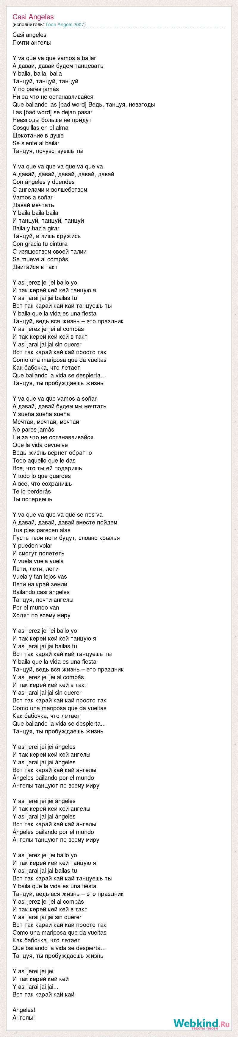 Casi angeles Почти ангелы Y va que va que vamos a bailar А давай, давай будем танцевать Y baila, baila, baila Танцуй, танцуй, танцуй Y no pares jamás Ни за что не останавливайся Que bailando las [bad word] Ведь, танцуя, невзгоды Las [bad word] se dejan pasar Невзгоды больше не придут Cosquillas en el alma Щекотание в душе Se siente al bailar Танцуя, почувствуешь ты Y va que va que va que va que va А давай, давай, давай, давай, давай Con ángeles y duendes С ангелами и волшебством Vamos a soñar Давай мечтать Y baila baila baila И танцуй, танцуй, танцуй Baila y hazla girar Танцуй, и лишь кружись Con gracia tu cintura С изяществом своей талии Se mueve al compás Двигайся в такт Y asi jerez jei jei bailo yo И так керей кей кей танцую я Y asi jarai jai jai bailas tu Вот так карай кай кай танцуешь ты Y baila que la vida es una fiesta Танцуй, ведь вся жизнь – это праздник Y asi jerez jei jei al compàs И так керей кей кей в такт Y asi jarai jai jai sin querer Вот так карай кай кай просто так Como una mariposa que da vueltas Как бабочка, что летает Que bailando la vida se despierta... Танцуя, ты пробуждаешь жизнь Y va que va que vamos a soñar А давай, давай будем мы мечтать Y sueña sueña sueña Мечтай, мечтай, мечтай No pares jamàs Ни за что не останавливайся Que la vida devuelve Ведь жизнь вернет обратно Todo aquello que le das Все, что ты ей подаришь Y todo lo que guardes А все, что сохранишь Te lo perderás Ты потеряешь Y va que va que va que se nos va А давай, давай, давай вместе пойдем Tus pies parecen alas Пусть твои ноги будут, словно крылья Y pueden volar И cмогут полететь Y vuela vuela vuela Лети, лети, лети Vuela y tan lejos vas Лети на край земли Bailando casi àngeles Танцуя, почти ангелы Por el mundo van Ходят по всему миру Y asi jerez jei jei bailo yo И так керей кей кей танцую я Y asi jarai jai jai bailas tu Вот так карай кай кай танцуешь ты Y baila que la vida es una fiesta Танцуй, ведь вся жизнь – это праздник Y asi jerez jei jei al compàs И так керей кей кей в такт Y asi jarai jai jai sin querer Вот так карай кай кай просто так Como una mariposa que da vueltas Как бабочка, что летает Que bailando la vida se despierta... Танцуя, ты пробуждаешь жизнь Y asi jerei jei jei ángeles И так керей кей кей ангелы Y asi jarai jai jai ángeles Вот так карай кай кай ангелы Ángeles bailando por el mundo Ангелы танцуют по всему миру Y asi jerei jei jei ángeles И так керей кей кей ангелы Y asi jarai jai jai ángeles Вот так карай кай кай ангелы Ángeles bailando por el mundo Ангелы танцуют по всему миру Y asi jerez jei jei bailo yo И так керей кей кей танцую я Y asi jarai jai jai bailas tu Вот так карай кай кай танцуешь ты Y baila que la vida es una fiesta Танцуй, ведь вся жизнь – это праздник Y asi jerez jei jei al compàs И так керей кей кей в такт Y asi jarai jai jai sin querer Вот так карай кай кай просто так Como una mariposa que da vueltas Как бабочка, что летает Que bailando la vida se despierta... Танцуя, ты пробуждаешь жизнь Y asi jerei jei jei И так керей кей кей Y asi jarai jai jai... Вот так карай кай кай Angeles! Ангелы!