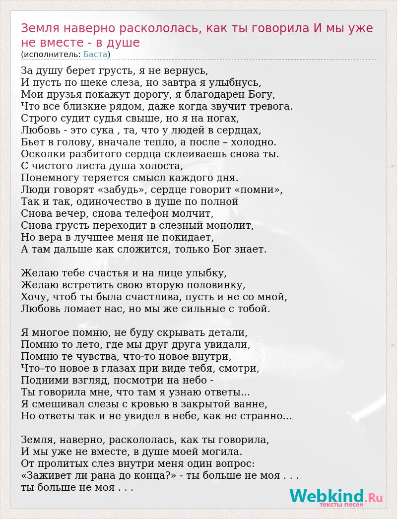 За душу берет грусть, я не вернусь, И пусть по щеке слеза, но завтра я улыбнусь, Мои друзья покажут дорогу, я благодарен Богу, Что все близкие рядом, даже когда звучит тревога. Строго судит судья свыше, но я на ногах, Любовь - это сука , та, что у людей в сердцах, Бьет в голову, вначале тепло, а после – холодно. Осколки разбитого сердца склеиваешь снова ты. С чистого листа душа холоста, Понемногу теряется смысл каждого дня. Люди говорят «забудь», сердце говорит «помни», Так и так, одиночество в душе по полной Снова вечер, снова телефон молчит, Снова грусть переходит в слезный монолит, Но вера в лучшее меня не покидает, А там дальше как сложится, только Бог знает. Желаю тебе счастья и на лице улыбку, Желаю встретить свою вторую половинку, Хочу, чтоб ты была счастлива, пусть и не со мной, Любовь ломает нас, но мы же сильные с тобой. Я многое помню, не буду скрывать детали, Помню то лето, где мы друг друга увидали, Помню те чувства, что-то новое внутри, Что–то новое в глазах при виде тебя, смотри, Подними взгляд, посмотри на небо - Ты говорила мне, что там я узнаю ответы... Я смешивал слезы с кровью в закрытой ванне, Но ответы так и не увидел в небе, как не странно... Земля, наверно, раскололась, как ты говорила, И мы уже не вместе, в душе моей могила. От пролитых слез внутри меня один вопрос: «Заживет ли рана до конца?» - ты больше не моя . . . ты больше не моя . . .