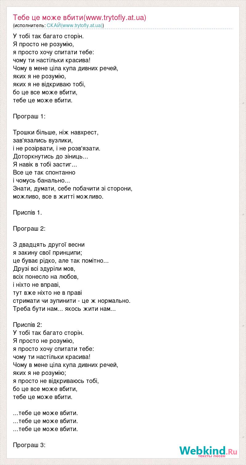 У тобі так багато сторін. Я просто не розумію, я просто хочу спитати тебе: чому ти настільки красива! Чому в мене ціла купа дивних речей, яких я не розумію, яких я не відкриваю тобі, бо це все може вбити, тебе це може вбити. Програш 1: Трошки більше, ніж навхрест, зав'язались вузлики, і не розірвати, і не розв'язати. Доторкнутись до зіниць... Я навік в тобі застиг... Все це так спонтанно і чомусь банально... Знати, думати, себе побачити зі сторони, можливо, все в житті можливо. Приспів 1. Програш 2: З двадцять другої весни я закину свої принципи; це буває рідко, але так помітно... Друзі всі здуріли мов, всіх понесло на любов, і ніхто не вправі, тут вже ніхто не в праві стримати чи зупинити - це ж нормально. Треба бути нам... якось жити нам... Приспів 2: У тобі так багато сторін. Я просто не розумію, я просто хочу спитати тебе: чому ти настільки красива! Чому в мене ціла купа дивних речей, яких я не розумію; я просто не відкриваюсь тобі, бо це все може вбити, тебе це може вбити. ...тебе це може вбити. ...тебе це може вбити. ...тебе це може вбити. Програш 3: