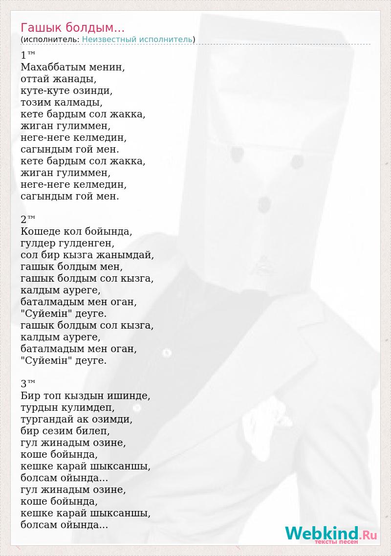 1™ Махаббатым менин, оттай жанады, куте-куте озинди, тозим калмады, кете бардым сол жакка, жиган гулиммен, неге-неге келмедин, сагындым гой мен. кете бардым сол жакка, жиган гулиммен, неге-неге келмедин, сагындым гой мен. 2™ Кошеде кол бойында, гулдер гулденген, сол бир кызга жанымдай, гашык болдым мен, гашык болдым сол кызга, калдым ауреге, баталмадым мен оган, "Суйемiн" деуге. гашык болдым сол кызга, калдым ауреге, баталмадым мен оган, "Суйемiн" деуге. 3™ Бир топ кыздын ишинде, турдын кулимдеп, тургандай ак озимди, бир сезим билеп, гул жинадым озине, коше бойында, кешке карай шыксаншы, болсам ойында... гул жинадым озине, коше бойында, кешке карай шыксаншы, болсам ойында...