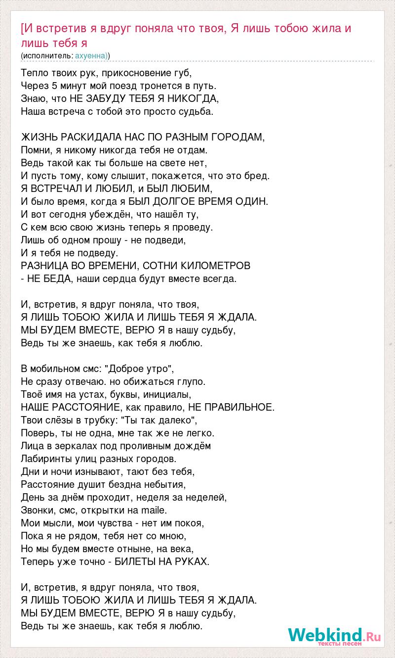 Тепло твоих рук, прикосновение губ, Через 5 минут мой поезд тронется в путь. Знаю, что НЕ ЗАБУДУ ТЕБЯ Я НИКОГДА, Наша встреча с тобой это просто судьба. ЖИЗНЬ РАСКИДАЛА НАС ПО РАЗНЫМ ГОРОДАМ, Помни, я никому никогда тебя не отдам. Ведь такой как ты больше на свете нет, И пусть тому, кому слышит, покажется, что это бред. Я ВСТРЕЧАЛ И ЛЮБИЛ, и БЫЛ ЛЮБИМ, И было время, когда я БЫЛ ДОЛГОЕ ВРЕМЯ ОДИН. И вот сегодня убеждён, что нашёл ту, С кем всю свою жизнь теперь я проведу. Лишь об одном прошу - не подведи, И я тебя не подведу. РАЗНИЦА ВО ВРЕМЕНИ, СОТНИ КИЛОМЕТРОВ - НЕ БЕДА, наши сердца будут вместе всегда. И, встретив, я вдруг поняла, что твоя, Я ЛИШЬ ТОБОЮ ЖИЛА И ЛИШЬ ТЕБЯ Я ЖДАЛА. МЫ БУДЕМ ВМЕСТЕ, ВЕРЮ Я в нашу судьбу, Ведь ты же знаешь, как тебя я люблю. В мобильном смс: "Доброе утро", Не сразу отвечаю. но обижаться глупо. Твоё имя на устах, буквы, инициалы, НАШЕ РАССТОЯНИЕ, как правило, НЕ ПРАВИЛЬНОЕ. Твои слёзы в трубку: "Ты так далеко", Поверь, ты не одна, мне так же не легко. Лица в зеркалах под проливным дождём Лабиринты улиц разных городов. Дни и ночи изнывают, тают без тебя, Расстояние душит бездна небытия, День за днём проходит, неделя за неделей, Звонки, смс, открытки на mailе. Мои мысли, мои чувства - нет им покоя, Пока я не рядом, тебя нет со мною, Но мы будем вместе отныне, на века, Теперь уже точно - БИЛЕТЫ НА РУКАХ. И, встретив, я вдруг поняла, что твоя, Я ЛИШЬ ТОБОЮ ЖИЛА И ЛИШЬ ТЕБЯ Я ЖДАЛА. МЫ БУДЕМ ВМЕСТЕ, ВЕРЮ Я в нашу судьбу, Ведь ты же знаешь, как тебя я люблю.