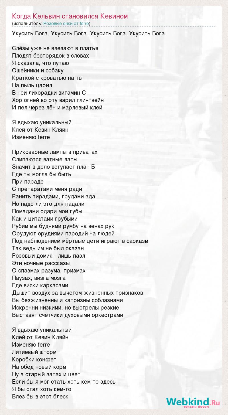 Укусить Бога. Укусить Бога. Укусить Бога. Укусить Бога. Слёзы уже не влезают в платья Плодят беспорядок в словах Я сказала, что путаю Ошейники и собаку Краткой с кроватью на ты На пыль царил В ней лихорадки витамин С Хор огней во рту варил глинтвейн И пел через лён и марлевый клей Я вдыхаю уникальный Клей от Кевин Кляйн Изменяю ferre Приковарные лампы в приватах Слипаются ватные лапы Значит в дело вступает план Б Где ты могла бы быть При параде С препаратами меня ради Ранить тирадами, грудами ада Но надо ли это для падали Помадами одари мои губы Как и цитатами грубыми Рубим мы буднями румбу на венах рук Орудуют орудиями пародий на людей Под наблюдением мёртвые дети играют в сарказм Так ведь им не был оказан Розовый домик - лишь пазл Эти ночные рассказы О спазмах разума, призмах Паузах, визга мозга Где виски каркасами Дышит воздух за вычетом жизненных признаков Вы безжизненны и капризны соблазнами Искренни низкими, но выстрелы резкие Выставят счётчики духовыми оркестрами Я вдыхаю уникальный Клей от Кевин Кляйн Изменяю ferre Литиевый шторм Коробки конфет На обед новый корм Ну а старый запах и цвет Если бы я мог стать хоть кем-то здесь Я бы стал хоть кем-то Влез бы в этот блеск