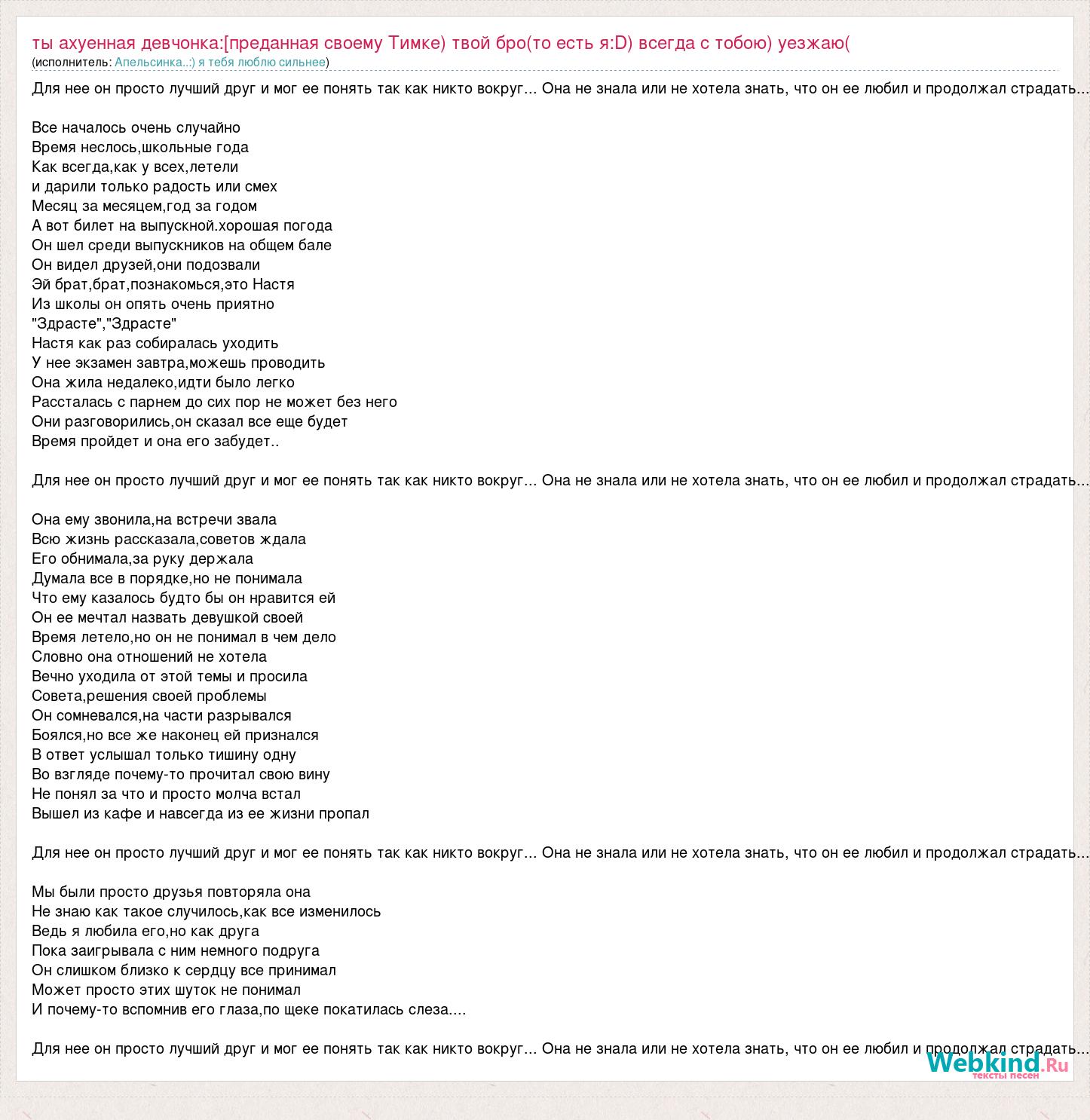 Главная→Исполнители→Апельсинка..:) я тебя люблю сильнее→Ты ахуенная девчонка:[преданная своему Тимке) твой бро(то есть я:D) все