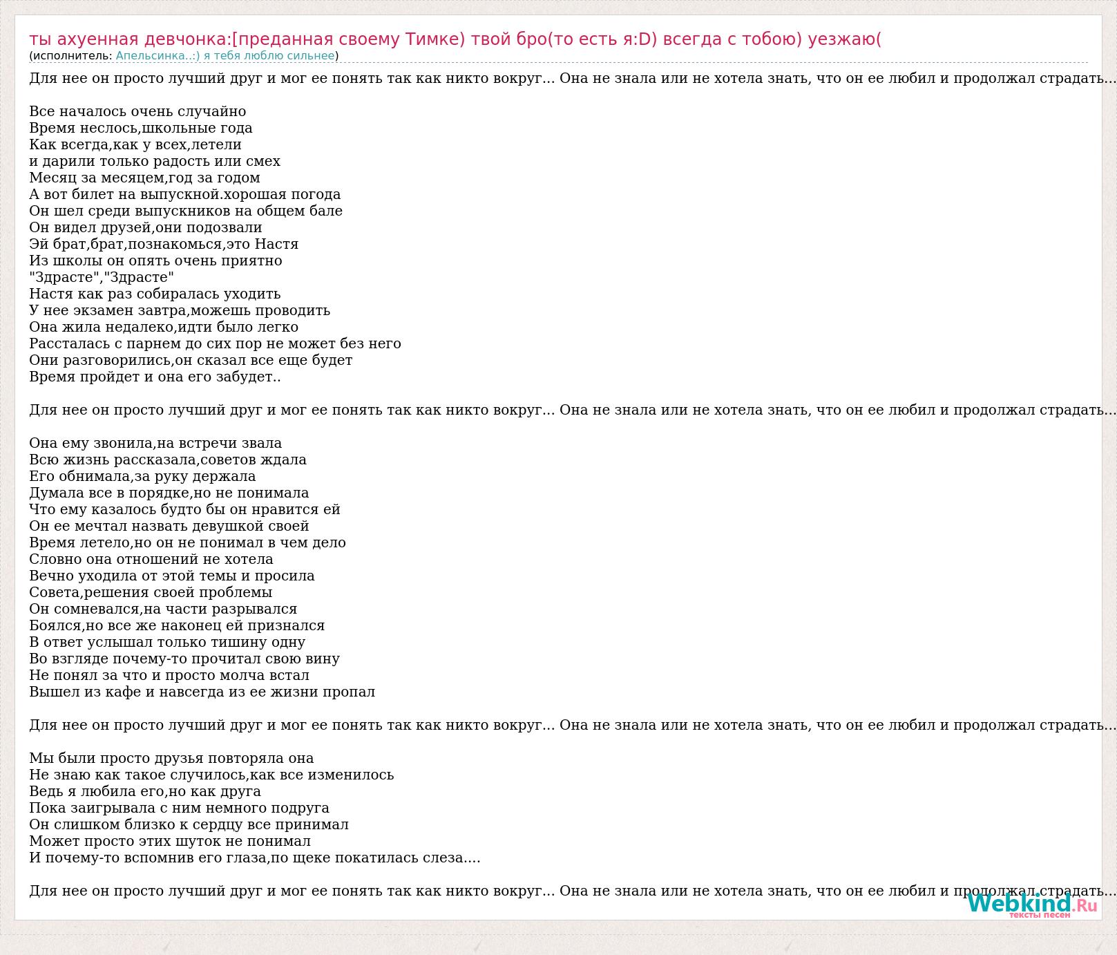 Главная→Исполнители→Апельсинка..:) я тебя люблю сильнее→Ты ахуенная девчонка:[преданная своему Тимке) твой бро(то есть я:D) все