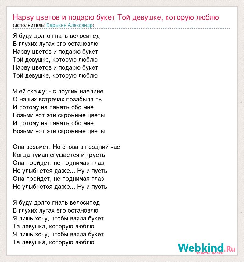 Я буду долго гнать велосипед В глухих лугах его остановлю Нарву цветов и подарю букет Той девушке, которую люблю Нарву цветов и подарю букет Той девушке, которую люблю Я ей скажу: - с другим наедине О наших встречах позабыла ты И потому на память обо мне Возьми вот эти скромные цветы И потому на память обо мне Возьми вот эти скромные цветы Она возьмет. Но снова в поздний час Когда туман сгущается и грусть Она пройдет, не поднимая глаз Не улыбнется даже... Ну и пусть Она пройдет, не поднимая глаз Не улыбнется даже... Ну и пусть Я буду долго гнать велосипед В глухих лугах его остановлю Я лишь хочу, чтобы взяла букет Та девушка, которую люблю Я лишь хочу, чтобы взяла букет Та девушка, которую люблю
