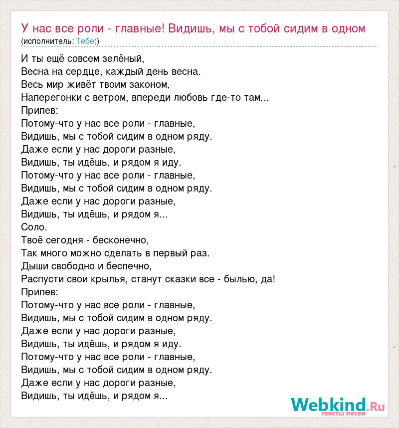 И ты ещё совсем зелёный, Весна на сердце, каждый день весна. Весь мир живёт твоим законом, Наперегонки с ветром, впереди любовь где-то там... Припев: Потому-что у нас все роли - главные, Видишь, мы с тобой сидим в одном ряду. Даже если у нас дороги разные, Видишь, ты идёшь, и рядом я иду. Потому-что у нас все роли - главные, Видишь, мы с тобой сидим в одном ряду. Даже если у нас дороги разные, Видишь, ты идёшь, и рядом я... Соло. Твоё сегодня - бесконечно, Так много можно сделать в первый раз. Дыши свободно и беспечно, Распусти свои крылья, станут сказки все - былью, да! Припев: Потому-что у нас все роли - главные, Видишь, мы с тобой сидим в одном ряду. Даже если у нас дороги разные, Видишь, ты идёшь, и рядом я иду. Потому-что у нас все роли - главные, Видишь, мы с тобой сидим в одном ряду. Даже если у нас дороги разные, Видишь, ты идёшь, и рядом я...
