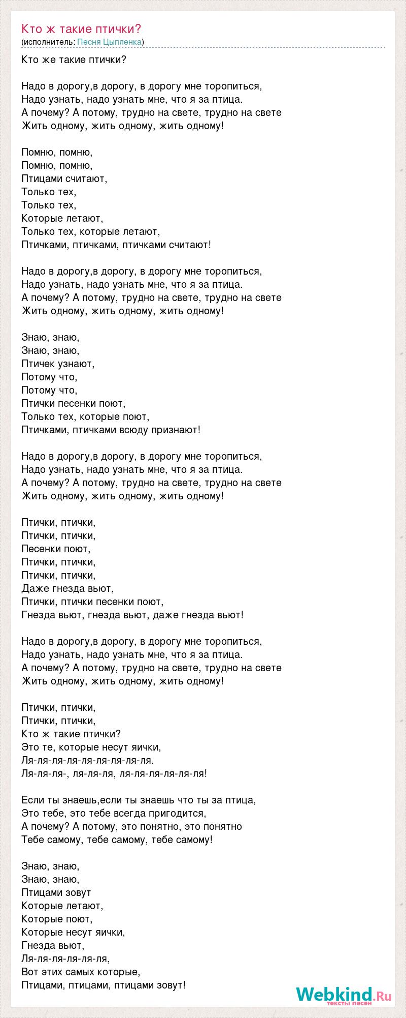 Кто же такие птички? Надо в дорогу,в дорогу, в дорогу мне торопиться, Надо узнать, надо узнать мне, что я за птица. А почему? А потому, трудно на свете, трудно на свете Жить одному, жить одному, жить одному! Помню, помню, Помню, помню, Птицами считают, Только тех, Только тех, Которые летают, Только тех, которые летают, Птичками, птичками, птичками считают! Надо в дорогу,в дорогу, в дорогу мне торопиться, Надо узнать, надо узнать мне, что я за птица. А почему? А потому, трудно на свете, трудно на свете Жить одному, жить одному, жить одному! Знаю, знаю, Знаю, знаю, Птичек узнают, Потому что, Потому что, Птички песенки поют, Только тех, которые поют, Птичками, птичками всюду признают! Надо в дорогу,в дорогу, в дорогу мне торопиться, Надо узнать, надо узнать мне, что я за птица. А почему? А потому, трудно на свете, трудно на свете Жить одному, жить одному, жить одному! Птички, птички, Птички, птички, Песенки поют, Птички, птички, Птички, птички, Даже гнезда вьют, Птички, птички песенки поют, Гнезда вьют, гнезда вьют, даже гнезда вьют! Надо в дорогу,в дорогу, в дорогу мне торопиться, Надо узнать, надо узнать мне, что я за птица. А почему? А потому, трудно на свете, трудно на свете Жить одному, жить одному, жить одному! Птички, птички, Птички, птички, Кто ж такие птички? Это те, которые несут яички, Ля-ля-ля-ля-ля-ля-ля-ля-ля. Ля-ля-ля-, ля-ля-ля, ля-ля-ля-ля-ля-ля! Если ты знаешь,если ты знаешь что ты за птица, Это тебе, это тебе всегда пригодится, А почему? А потому, это понятно, это понятно Тебе самому, тебе самому, тебе самому! Знаю, знаю, Знаю, знаю, Птицами зовут Которые летают, Которые поют, Которые несут яички, Гнезда вьют, Ля-ля-ля-ля-ля-ля, Вот этих самых которые, Птицами, птицами, птицами зовут!