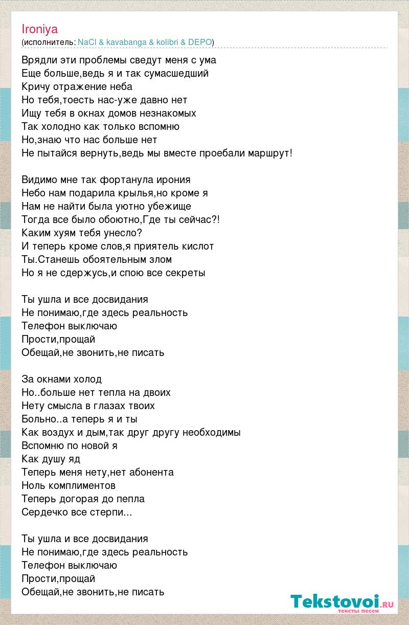 Врядли эти проблемы сведут меня с ума Еще больше,ведь я и так сумасшедший Кричу отражение неба Но тебя,тоесть нас-уже давно нет Ищу тебя в окнах домов незнакомых Так холодно как только вспомню Но,знаю что нас больше нет Не пытайся вернуть,ведь мы вместе проебали маршрут! Видимо мне так фортанула ирония Небо нам подарила крылья,но кроме я Нам не найти была уютно убежище Тогда все было обоютно,Где ты сейчас?! Каким хуям тебя унесло? И теперь кроме слов,я приятель кислот Ты.Станешь обоятельным злом Но я не сдержусь,и спою все секреты Ты ушла и все досвидания Не понимаю,где здесь реальность Телефон выключаю Прости,прощай Обещай,не звонить,не писать За окнами холод Но..больше нет тепла на двоих Нету смысла в глазах твоих Больно..а теперь я и ты Как воздух и дым,так друг другу необходимы Вспомню по новой я Как душу яд Теперь меня нету,нет абонента Ноль комплиментов Теперь догорая до пепла Сердечко все стерпи... Ты ушла и все досвидания Не понимаю,где здесь реальность Телефон выключаю Прости,прощай Обещай,не звонить,не писать