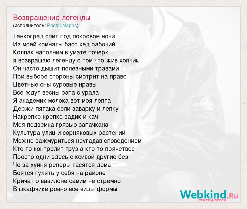 Танкоград спит под покровом ночи Из моей комнаты басс хед рабочий Колпак наполним в умате почерк я возвращаю легенду о том что жив хопчик Он часто дышит полезными травами При выборе стороны смотрит на право Цветные сны суровые нравы Все ждут весны рэпа с урала Я академик молока вот моя лепта Держи пятака если заварку и лепку Накрепко крепко задик и кач Моя подземка грязью запачкана Культура улиц и сорняковых растений Можно зажмуриться неугадав споведением Кто то контролит груз а кто то прячетвес Просто одни здесь с ксивой другие без Че за хуйня реперы гасятся дома Боятся гулять у себя на районе Кричат о вавилоне самим не стремно В шкафчике ровно все виды формы