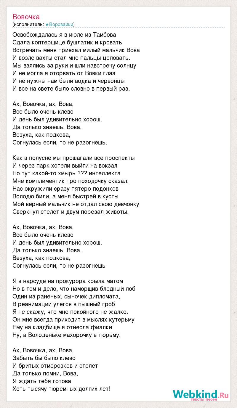 Освобождалась я в июле из Тамбова Сдала коптерщице бушлатик и кровать Встречать меня приехал милый мальчик Вова И возле вахты стал мне пальцы целовать. Мы взялись за руки и шли навстречу солнцу И не могла я оторвать от Вовки глаз И не нужны нам были водка и червонцы И все на свете было словно в первый раз. Ах, Вовочка, ах, Вова, Все было очень клево И день был удивительно хорош. Да только знаешь, Вова, Везуха, как подкова, Согнулась если, то не разогнешь. Как в полусне мы прошагали все проспекты И через парк хотели выйти на вокзал Но тут какой-то хмырь ??? интеллекта Мне комплиментик про походочку сказал. Нас окружили сразу пятеро подонков Володю били, а меня быстрей в кусты Мой верный мальчик не отдал свою девчонку Сверкнул стелет и двум порезал животы. Ах, Вовочка, ах, Вова, Все было очень клево И день был удивительно хорош. Да только знаешь, Вова, Везуха, как подкова, Согнулась если, то не разогнешь Я в нарсуде на прокурора крыла матом Но в том и дело, что наморщив бледный лоб Один из раненых, сыночек дипломата, В реанимации улегся в пышный гроб Я не скажу, что мне покойного не жалко. Он мне всегда приходит в мыслях кутерьму Ему на кладбище я отнесла фиалки Ну, а Володеньке махорочку в тюрьму. Ах, Вовочка, ах, Вова, Забыть бы было клево И бритых отморозков и стелет Да только помни, Вова, Я ждать тебя готова Хоть тысячу тюремных долгих лет!