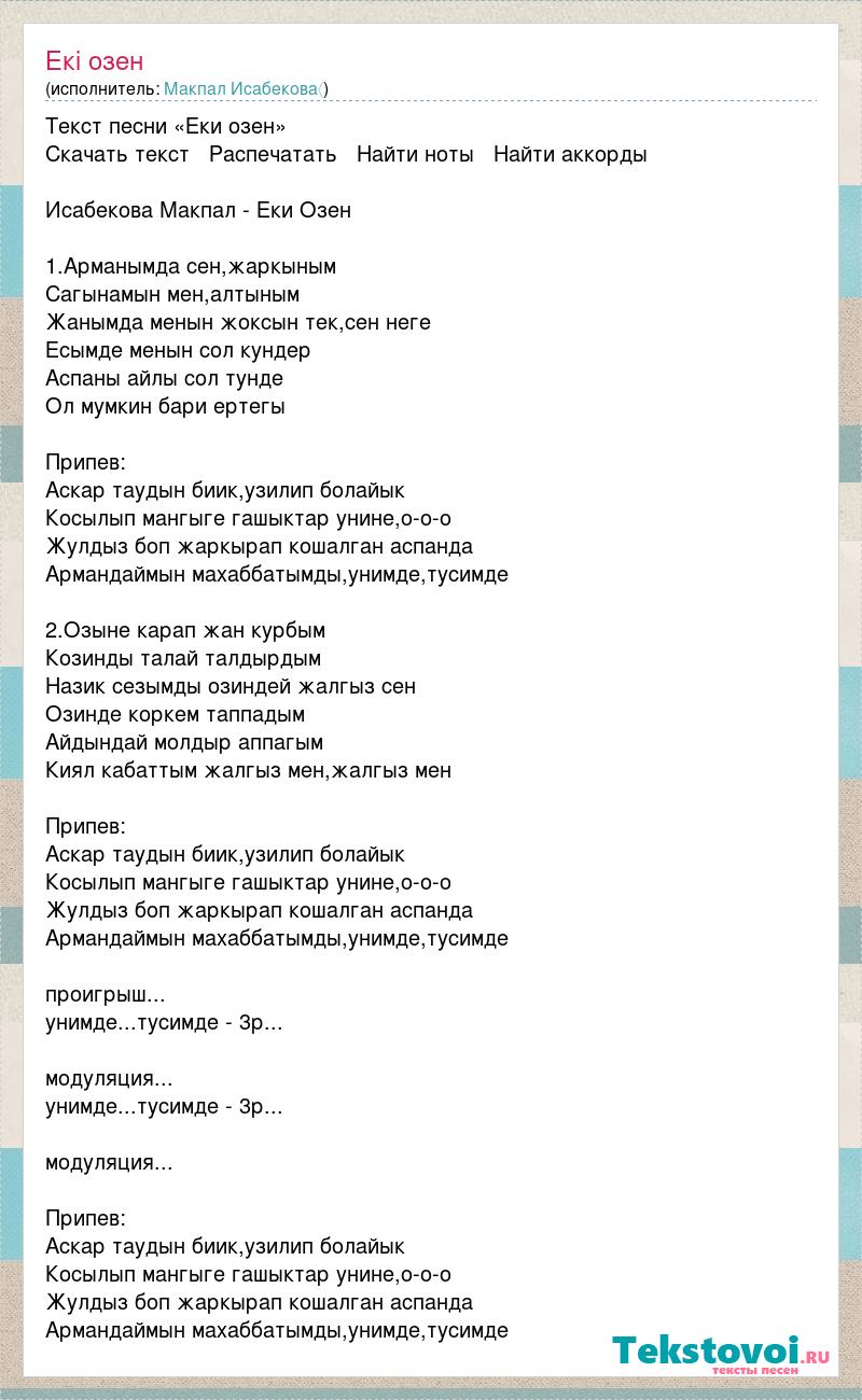 Текст песни «Еки озен» Скачать текст Распечатать Найти ноты Найти аккорды Исабекова Макпал - Еки Озен 1.Арманымда сен,жаркыным Сагынамын мен,алтыным Жанымда менын жоксын тек,сен неге Есымде менын сол кундер Аспаны айлы сол тунде Ол мумкин бари ертегы Припев: Аскар таудын биик,узилип болайык Косылып мангыге гашыктар унине,о-о-о Жулдыз боп жаркырап кошалган аспанда Армандаймын махаббатымды,унимде,тусимде 2.Озыне карап жан курбым Козинды талай талдырдым Назик сезымды озиндей жалгыз сен Озинде коркем таппадым Айдындай молдыр аппагым Киял кабаттым жалгыз мен,жалгыз мен Припев: Аскар таудын биик,узилип болайык Косылып мангыге гашыктар унине,о-о-о Жулдыз боп жаркырап кошалган аспанда Армандаймын махаббатымды,унимде,тусимде проигрыш... унимде...тусимде - 3р... модуляция... унимде...тусимде - 3р... модуляция... Припев: Аскар таудын биик,узилип болайык Косылып мангыге гашыктар унине,о-о-о Жулдыз боп жаркырап кошалган аспанда Армандаймын махаббатымды,унимде,тусимде