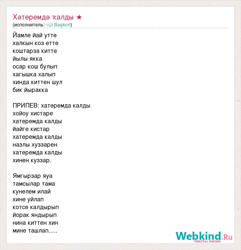 Йамле йай утте халкын коз етте коштарза китте йылы якка осар кош булып хагышка халып хинда киттен шул бик йыракка ПРИПЕВ: хатеремда калды хойоу хистаре хатеремда калды йайге кистар хатеремда калды назлы хуззарен хатеремда калды хинен куззар. Ямгырзар яуа тамсылар тама кунелем илай хине уйлап котсе калдырып йорак яндырып нина киттен хин мине ташлап.....
