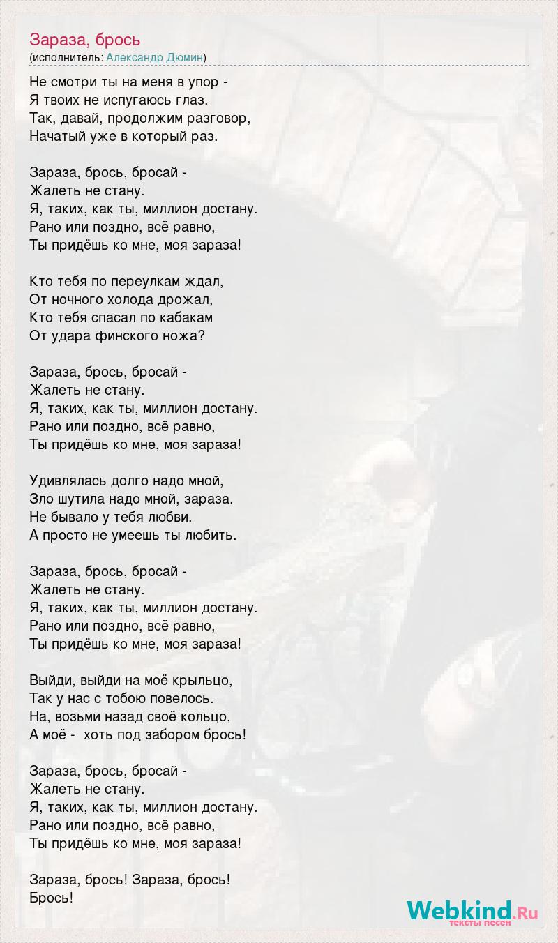 Не смотри ты на меня в упор - Я твоих не испугаюсь глаз. Так, давай, продолжим разговор, Начатый уже в который раз. Зараза, брось, бросай - Жалеть не стану. Я, таких, как ты, миллион достану. Рано или поздно, всё равно, Ты придёшь ко мне, моя зараза! Кто тебя по переулкам ждал, От ночного холода дрожал, Кто тебя спасал по кабакам От удара финского ножа? Зараза, брось, бросай - Жалеть не стану. Я, таких, как ты, миллион достану. Рано или поздно, всё равно, Ты придёшь ко мне, моя зараза! Удивлялась долго надо мной, Зло шутила надо мной, зараза. Не бывало у тебя любви. А просто не умеешь ты любить. Зараза, брось, бросай - Жалеть не стану. Я, таких, как ты, миллион достану. Рано или поздно, всё равно, Ты придёшь ко мне, моя зараза! Выйди, выйди на моё крыльцо, Так у нас с тобою повелось. На, возьми назад своё кольцо, А моё - хоть под забором брось! Зараза, брось, бросай - Жалеть не стану. Я, таких, как ты, миллион достану. Рано или поздно, всё равно, Ты придёшь ко мне, моя зараза! Зараза, брось! Зараза, брось! Брось!