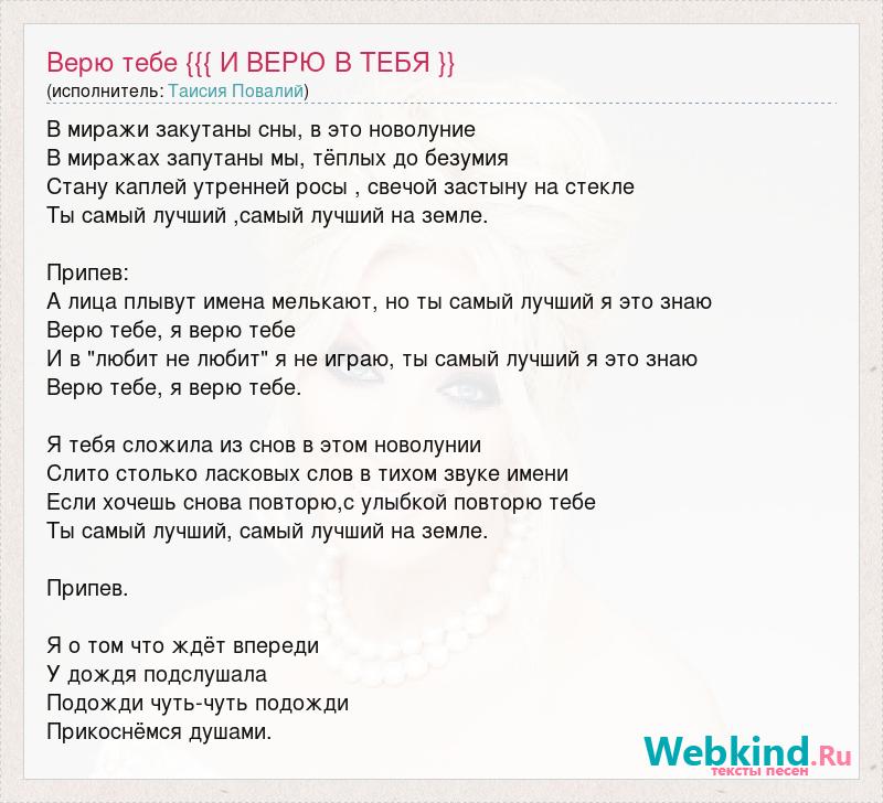 В миражи закутаны сны, в это новолуние В миражах запутаны мы, тёплых до безумия Стану каплей утренней росы , свечой застыну на стекле Ты самый лучший ,самый лучший на земле. Припев: А лица плывут имена мелькают, но ты самый лучший я это знаю Верю тебе, я верю тебе И в "любит не любит" я не играю, ты самый лучший я это знаю Верю тебе, я верю тебе. Я тебя сложила из снов в этом новолунии Слито столько ласковых слов в тихом звуке имени Если хочешь снова повторю,с улыбкой повторю тебе Ты самый лучший, самый лучший на земле. Припев. Я о том что ждёт впереди У дождя подслушала Подожди чуть-чуть подожди Прикоснёмся душами.