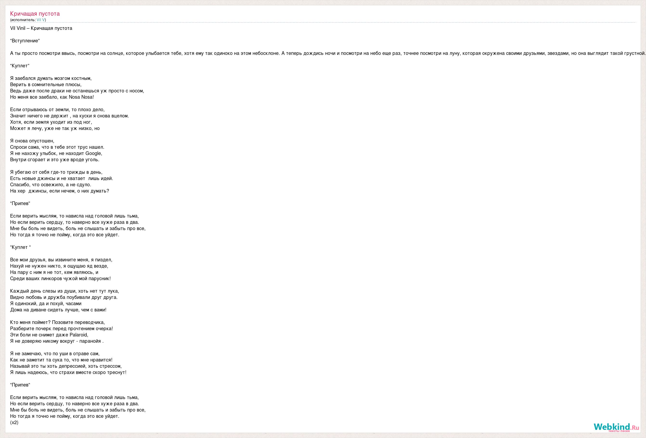 Vil Vinil – Кричащая пустота “Вступление” А ты просто посмотри ввысь, посмотри на солнце, которое улыбается тебе, хотя ему так одиноко на этом небосклоне. А теперь дождись ночи и посмотри на небо еще раз, точнее посмотри на луну, которая окружена своими друзьями, звездами, но она выглядит такой грустной. “Куплет” Я заебался думать мозгом костным, Верить в сомнительные плюсы, Ведь даже после драки не останешься уж просто с носом, Но меня все заебало, как Nosa Nosa! Если отрываюсь от земли, то плохо дело, Значит ничего не держит , на куски я снова вцелом. Хотя, если земля уходит из под ног, Может я лечу, уже не так уж низко, но Я снова опустошен, Спроси сама, что в тебе этот трус нашел. Я не нахожу улыбок, не находит Google, Внутри сгорает и это уже вроде уголь. Я убегаю от себя где-то трижды в день, Есть новые джинсы и не хватает лишь идей. Спасибо, что освежило, а не сдуло. На хер джинсы, если нечем, о них думать? “Припев” Если верить мыслям, то нависла над головой лишь тьма, Но если верить сердцу, то наверно все хуже раза в два. Мне бы боль не видеть, боль не слышать и забыть про все, Но тогда я точно не пойму, когда это все уйдет. “Куплет “ Все мои друзья, вы извините меня, я пиздел, Нахуй не нужен никто, я ощущаю яд везде, На пару с ним я не тот, кем являюсь, и Среди ваших линкоров чужой мой парусник! Каждый день слезы из души, хоть нет тут лука, Видно любовь и дружба поубивали друг друга. Я одинокий, да и похуй, часами Дома на диване сидеть лучше, чем с вами! Кто меня поймет? Позовите переводчика, Разберите почерк перед прочтением очерка! Эти боли не снимет даже Palaroid, Я не доверяю никому вокруг - паранойя . Я не замечаю, что по уши в отраве сам, Как не заметит та сука то, что мне нравится! Называй это ты хоть депрессией, хоть стрессом, Я лишь надеюсь, что страхи вместе скоро треснут! “Припев” Если верить мыслям, то нависла над головой лишь тьма, Но если верить сердцу, то наверно все хуже раза в два. Мне бы боль не видеть, боль не слышать и забыть про все, Но тогда я точно не пойму, когда это все уйдет. (x2)