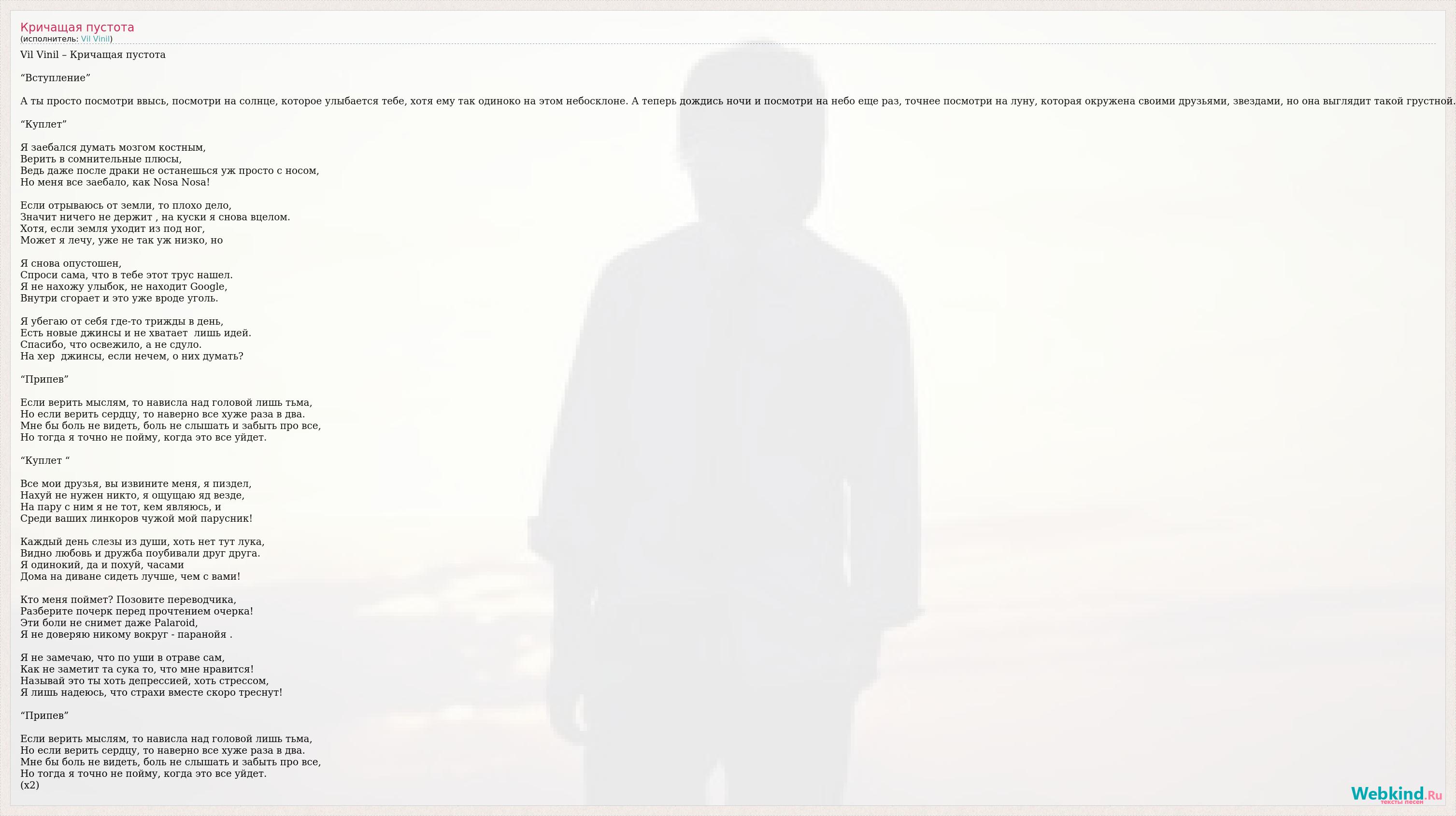 Vil Vinil – Кричащая пустота “Вступление” А ты просто посмотри ввысь, посмотри на солнце, которое улыбается тебе, хотя ему так одиноко на этом небосклоне. А теперь дождись ночи и посмотри на небо еще раз, точнее посмотри на луну, которая окружена своими друзьями, звездами, но она выглядит такой грустной. “Куплет” Я заебался думать мозгом костным, Верить в сомнительные плюсы, Ведь даже после драки не останешься уж просто с носом, Но меня все заебало, как Nosa Nosa! Если отрываюсь от земли, то плохо дело, Значит ничего не держит , на куски я снова вцелом. Хотя, если земля уходит из под ног, Может я лечу, уже не так уж низко, но Я снова опустошен, Спроси сама, что в тебе этот трус нашел. Я не нахожу улыбок, не находит Google, Внутри сгорает и это уже вроде уголь. Я убегаю от себя где-то трижды в день, Есть новые джинсы и не хватает лишь идей. Спасибо, что освежило, а не сдуло. На хер джинсы, если нечем, о них думать? “Припев” Если верить мыслям, то нависла над головой лишь тьма, Но если верить сердцу, то наверно все хуже раза в два. Мне бы боль не видеть, боль не слышать и забыть про все, Но тогда я точно не пойму, когда это все уйдет. “Куплет “ Все мои друзья, вы извините меня, я пиздел, Нахуй не нужен никто, я ощущаю яд везде, На пару с ним я не тот, кем являюсь, и Среди ваших линкоров чужой мой парусник! Каждый день слезы из души, хоть нет тут лука, Видно любовь и дружба поубивали друг друга. Я одинокий, да и похуй, часами Дома на диване сидеть лучше, чем с вами! Кто меня поймет? Позовите переводчика, Разберите почерк перед прочтением очерка! Эти боли не снимет даже Palaroid, Я не доверяю никому вокруг - паранойя . Я не замечаю, что по уши в отраве сам, Как не заметит та сука то, что мне нравится! Называй это ты хоть депрессией, хоть стрессом, Я лишь надеюсь, что страхи вместе скоро треснут! “Припев” Если верить мыслям, то нависла над головой лишь тьма, Но если верить сердцу, то наверно все хуже раза в два. Мне бы боль не видеть, боль не слышать и забыть про все, Но тогда я точно не пойму, когда это все уйдет. (x2)