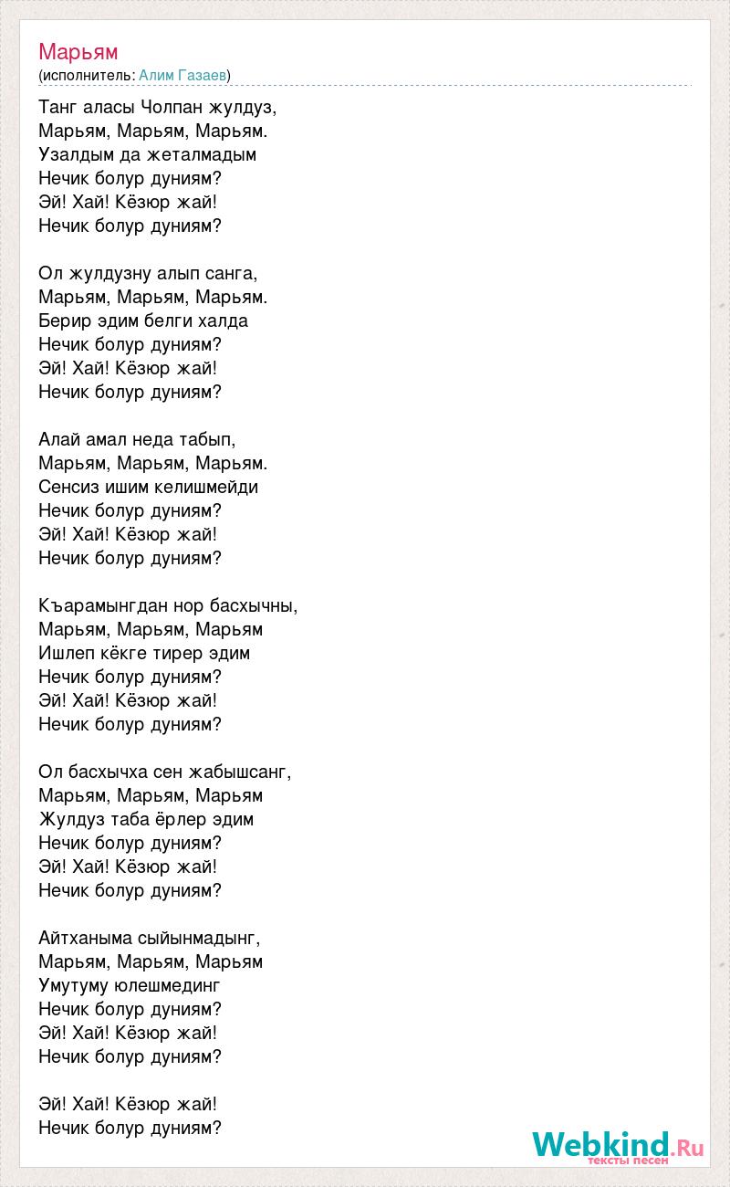 Танг аласы Чолпан жулдуз, Марьям, Марьям, Марьям. Узалдым да жеталмадым Нечик болур дуниям? Эй! Хай! Кёзюр жай! Нечик болур дуниям? Ол жулдузну алып санга, Марьям, Марьям, Марьям. Берир эдим белги халда Нечик болур дуниям? Эй! Хай! Кёзюр жай! Нечик болур дуниям? Алай амал неда табып, Марьям, Марьям, Марьям. Сенсиз ишим келишмейди Нечик болур дуниям? Эй! Хай! Кёзюр жай! Нечик болур дуниям? Къарамынгдан нор басхычны, Марьям, Марьям, Марьям Ишлеп кёкге тирер эдим Нечик болур дуниям? Эй! Хай! Кёзюр жай! Нечик болур дуниям? Ол басхычха сен жабышсанг, Марьям, Марьям, Марьям Жулдуз таба ёрлер эдим Нечик болур дуниям? Эй! Хай! Кёзюр жай! Нечик болур дуниям? Айтханыма сыйынмадынг, Марьям, Марьям, Марьям Умутуму юлешмединг Нечик болур дуниям? Эй! Хай! Кёзюр жай! Нечик болур дуниям? Эй! Хай! Кёзюр жай! Нечик болур дуниям?