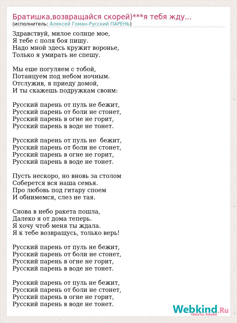 Здравствуй, милое солнце мое, Я тебе с поля боя пишу. Надо мной здесь кружит воронье, Только я умирать не спешу. Мы еше погуляем с тобой, Потанцуем под небом ночным. Отслужив, я приеду домой, И ты скажешь подружкам своим: Русский парень от пуль не бежит, Русский парень от боли не стонет, Русский парень в огне не горит, Русский парень в воде не тонет. Русский парень от пуль не бежит, Русский парень от боли не стонет, Русский парень в огне не горит, Русский парень в воде не тонет. Пусть нескоро, но вновь за столом Соберется вся наша семья. Про любовь под гитару споем И обнимемся, слез не тая. Снова в небо ракета пошла, Далеко я от дома теперь. Я хочу чтоб меня ты ждала. Я к тебе возвращусь, только верь! Русский парень от пуль не бежит, Русский парень от боли не стонет, Русский парень в огне не горит, Русский парень в воде не тонет. Русский парень от пуль не бежит, Русский парень от боли не стонет, Русский парень в огне не горит, Русский парень в воде не тонет.