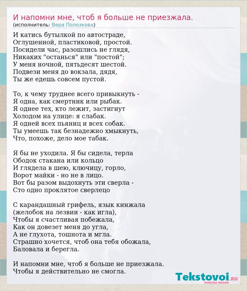 А как ты думаешь, о чем песня "И напомни мне, чтоб я больше не приезжала." ?