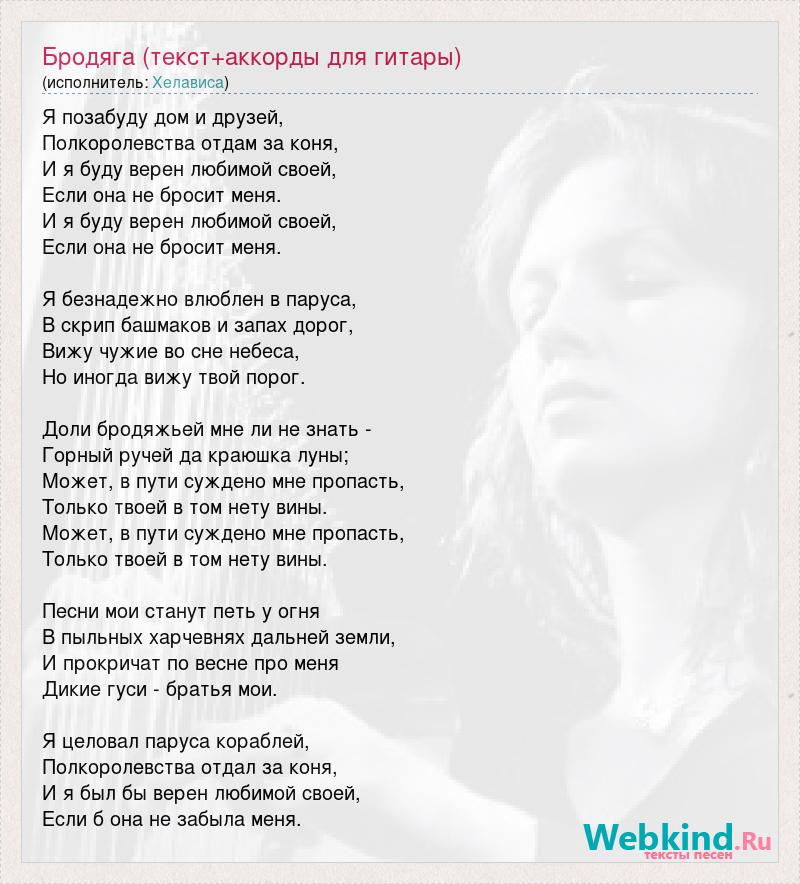 Я позабуду дом и друзей, Полкоролевства отдам за коня, И я буду верен любимой своей, Если она не бросит меня. И я буду верен любимой своей, Если она не бросит меня. Я безнадежно влюблен в паруса, В скрип башмаков и запах дорог, Вижу чужие во сне небеса, Но иногда вижу твой порог. Доли бродяжьей мне ли не знать - Горный ручей да краюшка луны; Может, в пути суждено мне пропасть, Только твоей в том нету вины. Может, в пути суждено мне пропасть, Только твоей в том нету вины. Песни мои станут петь у огня В пыльных харчевнях дальней земли, И прокричат по весне про меня Дикие гуси - братья мои. Я целовал паруса кораблей, Полкоролевства отдал за коня, И я был бы верен любимой своей, Если б она не забыла меня.