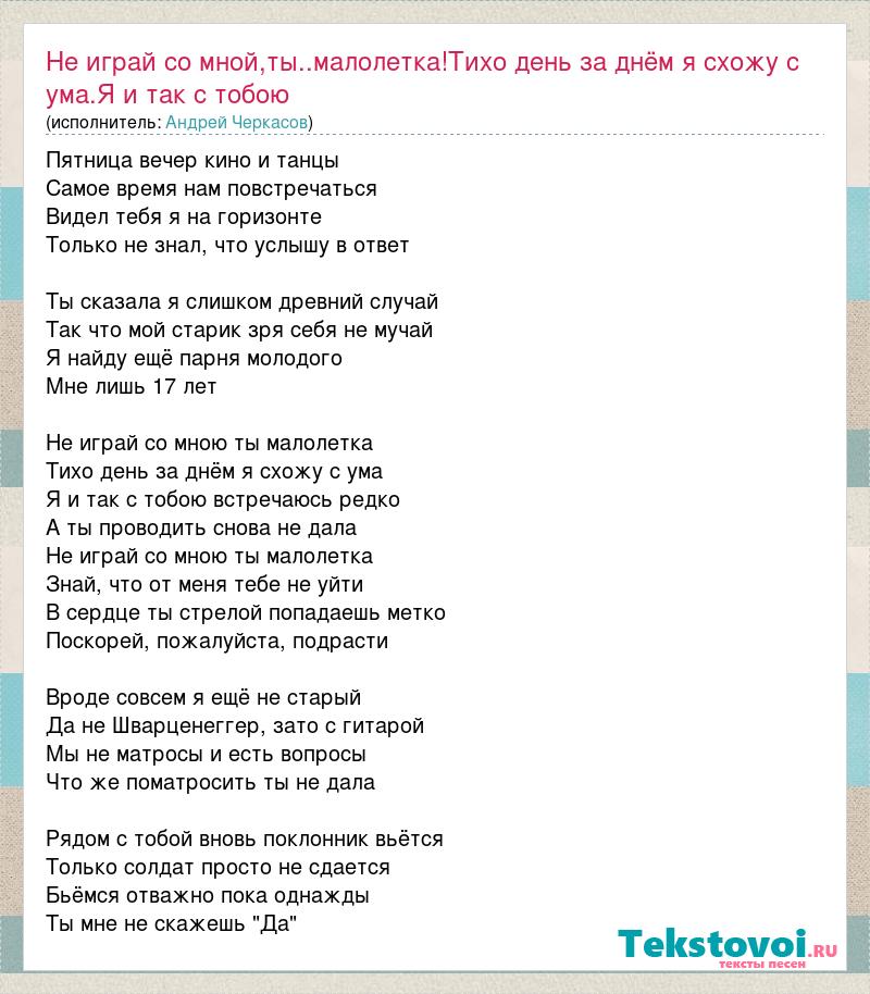 Главная→Исполнители→Андрей Черкасов→Не играй со мной,ты..малолетка!Тихо день за днём я схожу с ума.Я и так с
