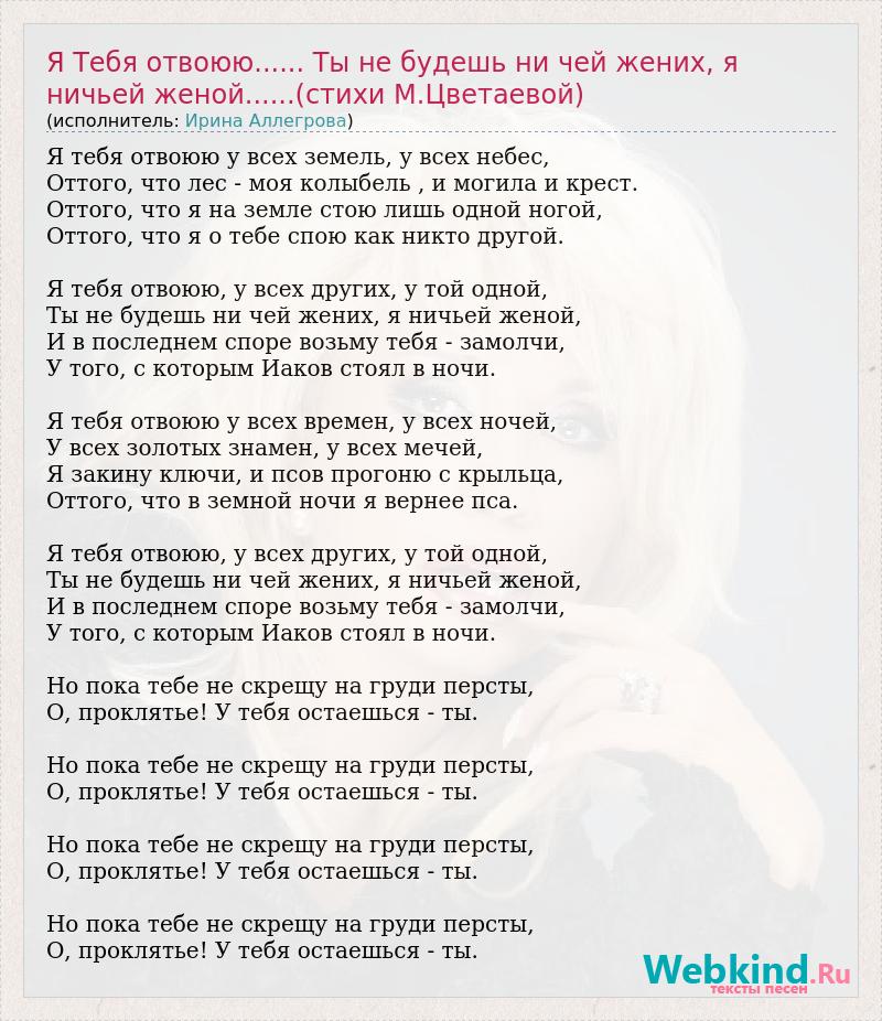 Главная→Исполнители→Ирина Аллегрова→Я Тебя отвоюю...... Ты не будешь ни чей жених, я ничьей женой......(стихи М.Ц