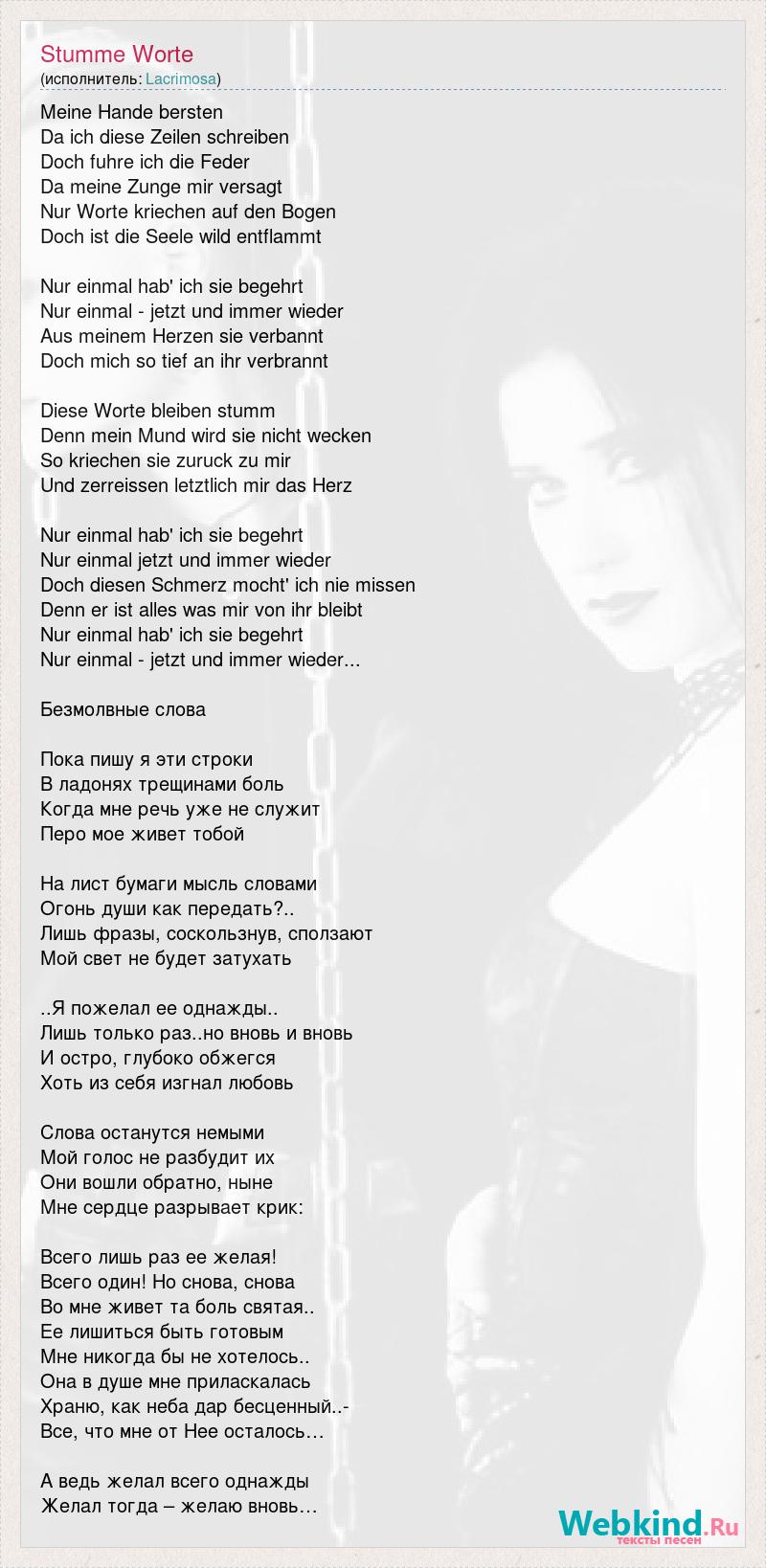 Meine Hande bersten Da ich diese Zeilen schreiben Doch fuhre ich die Feder Da meine Zunge mir versagt Nur Worte kriechen auf den Bogen Doch ist die Seele wild entflammt Nur einmal hab' ich sie begehrt Nur einmal - jetzt und immer wieder Aus meinem Herzen sie verbannt Doch mich so tief an ihr verbrannt Diese Worte bleiben stumm Denn mein Mund wird sie nicht wecken So kriechen sie zuruck zu mir Und zerreissen letztlich mir das Herz Nur einmal hab' ich sie begehrt Nur einmal jetzt und immer wieder Doch diesen Schmerz mocht' ich nie missen Denn er ist alles was mir von ihr bleibt Nur einmal hab' ich sie begehrt Nur einmal - jetzt und immer wieder... Безмолвные слова Пока пишу я эти строки В ладонях трещинами боль Когда мне речь уже не служит Перо мое живет тобой На лист бумаги мысль словами Огонь души как передать?.. Лишь фразы, соскользнув, сползают Мой свет не будет затухать ..Я пожелал ее однажды.. Лишь только раз..но вновь и вновь И остро, глубоко обжегся Хоть из себя изгнал любовь Слова останутся немыми Мой голос не разбудит их Они вошли обратно, ныне Мне сердце разрывает крик: Всего лишь раз ее желая! Всего один! Но снова, снова Во мне живет та боль святая.. Ее лишиться быть готовым Мне никогда бы не хотелось.. Она в душе мне приласкалась Храню, как неба дар бесценный..- Все, что мне от Нее осталось… А ведь желал всего однажды Желал тогда – желаю вновь…