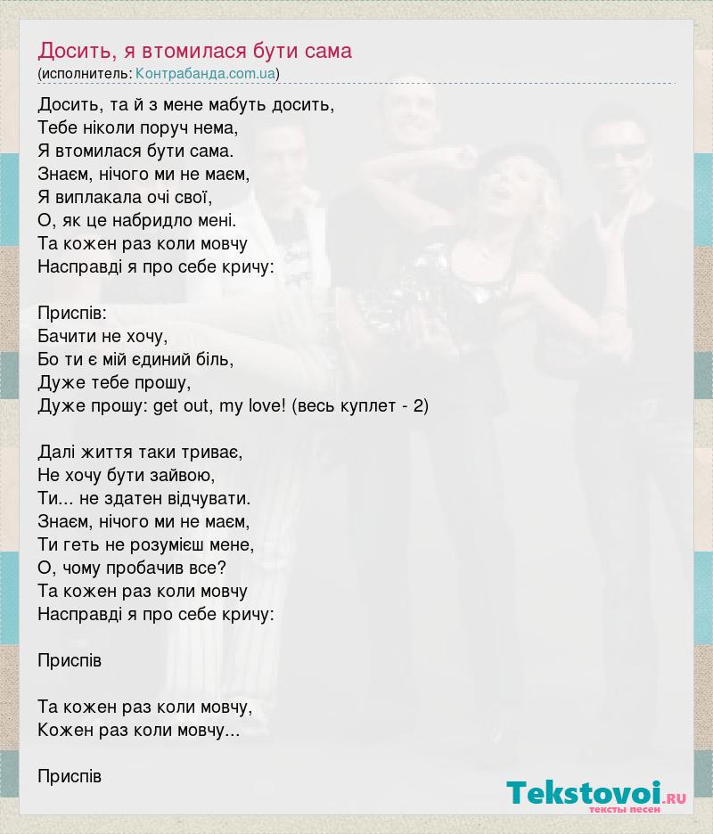 Досить, та й з мене мабуть досить, Тебе ніколи поруч нема, Я втомилася бути сама. Знаєм, нічого ми не маєм, Я виплакала очі свої, О, як це набридло мені. Та кожен раз коли мовчу Насправді я про себе кричу: Приспів: Бачити не хочу, Бо ти є мій єдиний біль, Дуже тебе прошу, Дуже прошу: get out, my love! (весь куплет - 2) Далі життя таки триває, Не хочу бути зайвою, Ти... не здатен відчувати. Знаєм, нічого ми не маєм, Ти геть не розумієш мене, О, чому пробачив все? Та кожен раз коли мовчу Насправді я про себе кричу: Приспів Та кожен раз коли мовчу, Кожен раз коли мовчу... Приспів