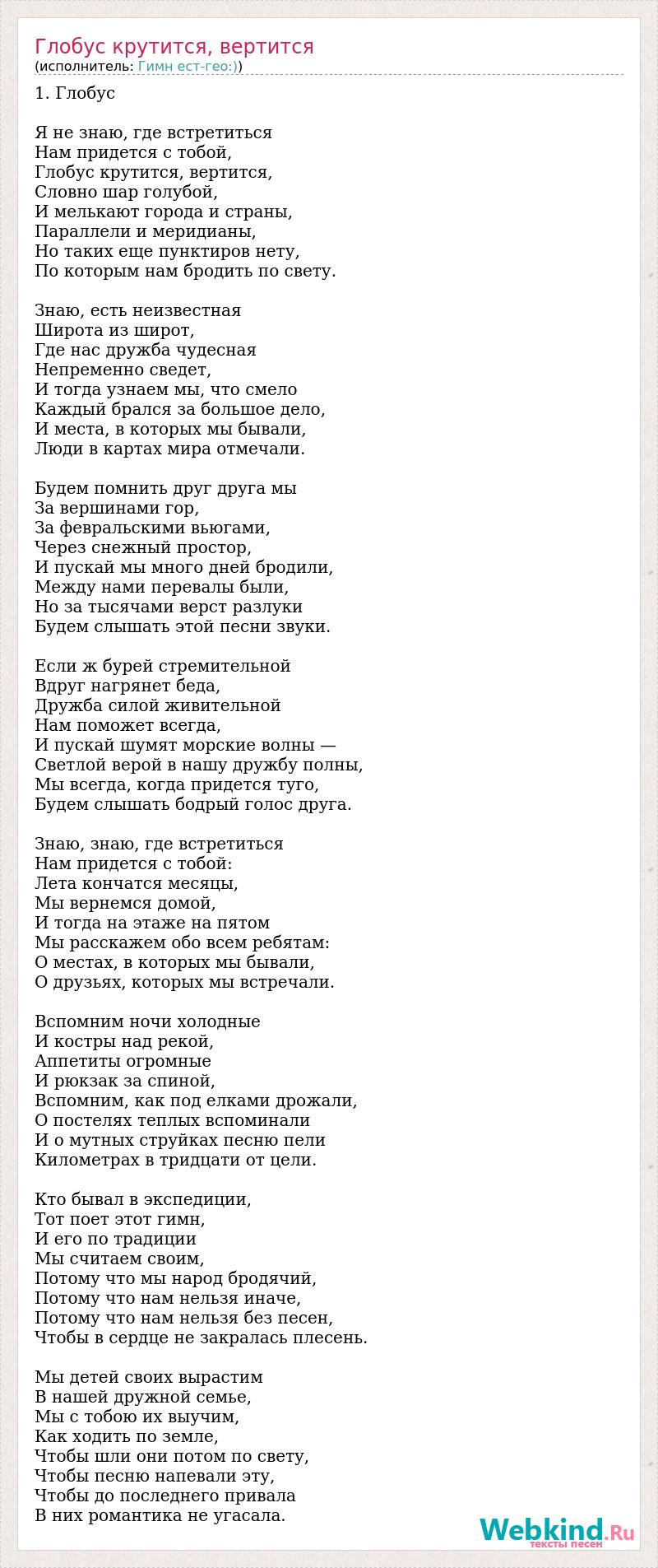 1. Глобус Я не знаю, где встретиться Нам придется с тобой, Глобус крутится, вертится, Словно шар голубой, И мелькают города и страны, Параллели и меридианы, Но таких еще пунктиров нету, По которым нам бродить по свету. Знаю, есть неизвестная Широта из широт, Где нас дружба чудесная Непременно сведет, И тогда узнаем мы, что смело Каждый брался за большое дело, И места, в которых мы бывали, Люди в картах мира отмечали. Будем помнить друг друга мы За вершинами гор, За февральскими вьюгами, Через снежный простор, И пускай мы много дней бродили, Между нами перевалы были, Но за тысячами верст разлуки Будем слышать этой песни звуки. Если ж бурей стремительной Вдруг нагрянет беда, Дружба силой живительной Нам поможет всегда, И пускай шумят морские волны — Светлой верой в нашу дружбу полны, Мы всегда, когда придется туго, Будем слышать бодрый голос друга. Знаю, знаю, где встретиться Нам придется с тобой: Лета кончатся месяцы, Мы вернемся домой, И тогда на этаже на пятом Мы расскажем обо всем ребятам: О местах, в которых мы бывали, О друзьях, которых мы встречали. Вспомним ночи холодные И костры над рекой, Аппетиты огромные И рюкзак за спиной, Вспомним, как под елками дрожали, О постелях теплых вспоминали И о мутных струйках песню пели Километрах в тридцати от цели. Кто бывал в экспедиции, Тот поет этот гимн, И его по традиции Мы считаем своим, Потому что мы народ бродячий, Потому что нам нельзя иначе, Потому что нам нельзя без песен, Чтобы в сердце не закралась плесень. Мы детей своих вырастим В нашей дружной семье, Мы с тобою их выучим, Как ходить по земле, Чтобы шли они потом по свету, Чтобы песню напевали эту, Чтобы до последнего привала В них романтика не угасала.