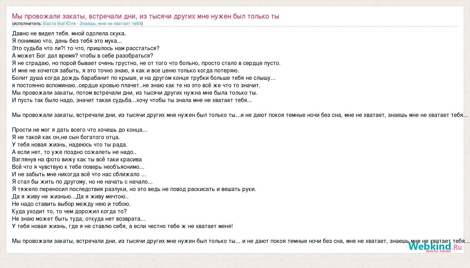 Давно не видел тебя. мной одолела скука. Я понимаю что, день без тебя это мука... Это судьба что ли?! то что, пришлось нам расстаться? А может Бог дал время? чтобы в себе разобраться? Я не страдаю, но порой бывает очень грустно, не от того что больно, просто стало в сердце пусто. И мне не хочется забыть, я это точно знаю, я как и все ценю только когда потеряю. Болит душа когда дождь барабанит по крыше, и на другом конце трубки больше тебя не слышу... я постоянно вспоминаю..сердце кровью плачет..не знаю как те но это всё же что то значит. Мы провожали закаты, потом встречали дни, из тысячи других нужна мне была только ты. И пусть так было надо, значит такая судьба...хочу чтобы ты знала мне не хватает тебя... Мы провожали закаты, встречали дни, из тысячи других мне нужен был только ты...и не дают покоя темные ночи без сна, мне не хватает, знаешь мне не хватает тебя... Прости не мог я дать всего что хочешь до конца... Я не такой как он,не сын богатого отца. У тебя новая жизнь, надеюсь что ты рада. А если нет, то уже поздно сожалеть не надо.. Взглянув на фото вижу как ты всё таки красива Всё что я чувствую к тебе поверь необъяснимо... И не забыть мне никогда всё что нас сближало ... Я стал бы жить по другому, но не начать с начало... Я тяжело переносил последствия разлуки, но это ведь не повод раскисать и вешать руки. Да я живу не жизнью...Да я живу мечтою.. Не надо ставить выбор между нею и тобою. Куда уходит то, то чем дорожил когда то? Не знаю может быть туда, откуда нет возврата... У тебя новая жизнь, где я не ставлю себя, а если честно тебе ж не хватает меня! Мы провожали закаты, встречали дни, из тысячи других мне нужен был только ты... и не дают покоя темные ночи без сна, мне не хватает, знаешь мне не хватает тебя...